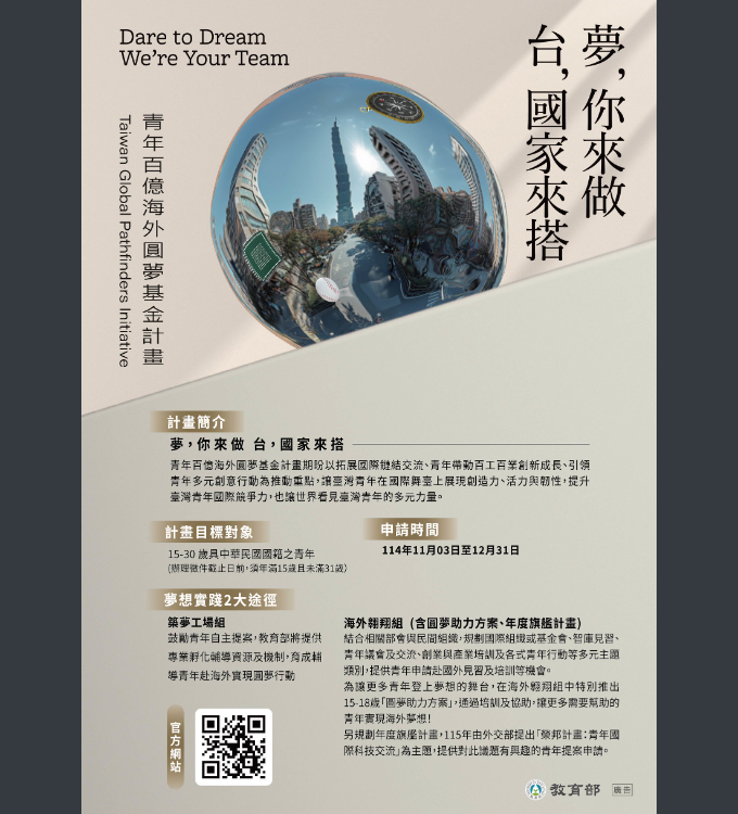 二、本計畫對象為本國15至30歲青年,分為築夢工場組與海外 翱翔組(含年度旗艦計畫),第1梯次報名自114年11月3日 起至12月31日,相關資訊可上計畫平臺查詢 (https://twpathfinder.org/):