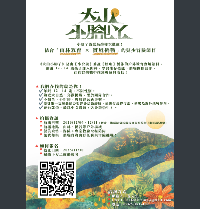 一、節目【大山小腳丫】是一檔兒少體驗實境節目,融合挑戰 性與教 育娛樂性,旨在帶領青少年探索山裡的自然,培養 生存技能與團隊合作精神。