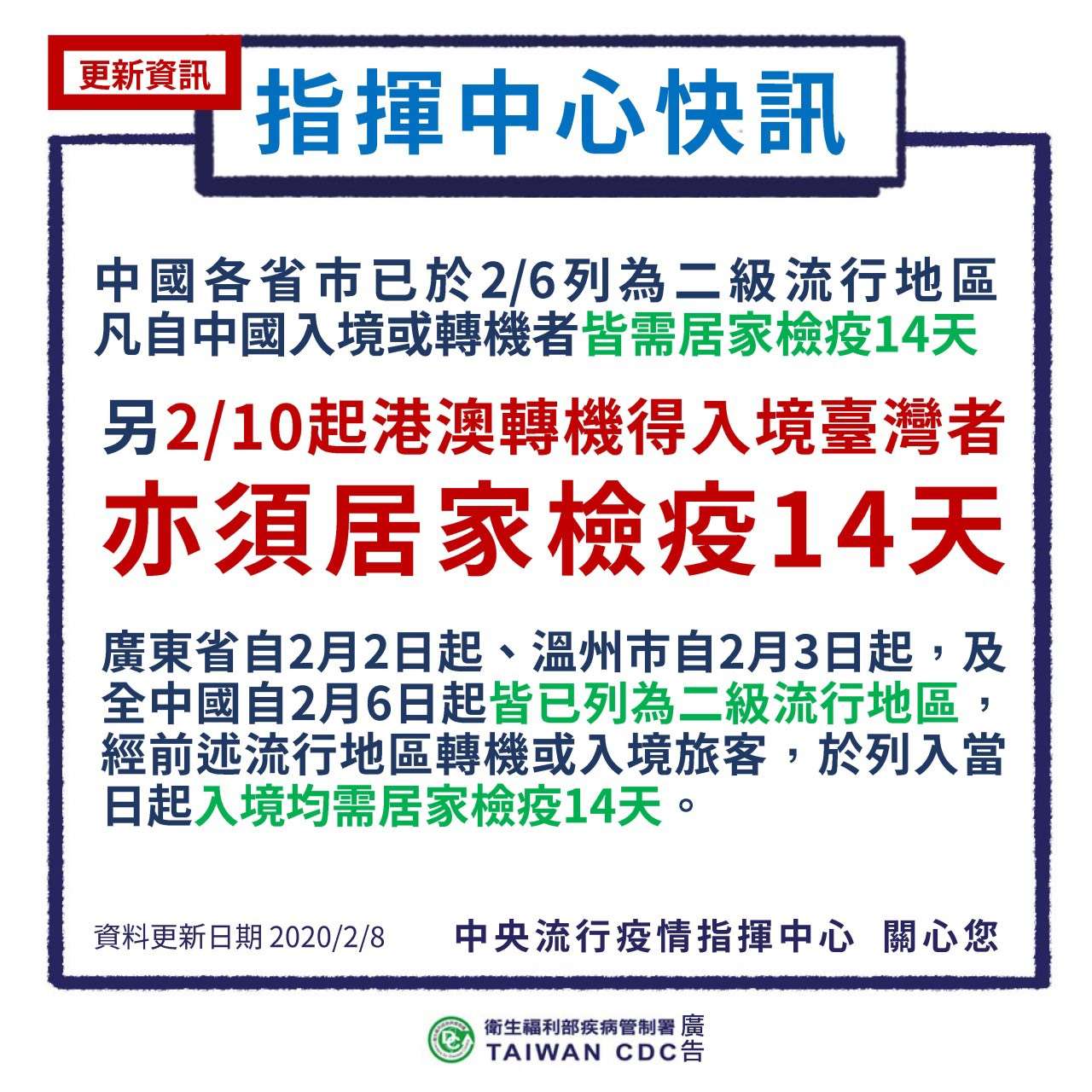 因應中國新型冠狀病毒肺炎疫情,中央流行疫情指揮中心宣布2月10日00時00分起經香港、澳門轉機入境旅客,需居家檢疫14天。至於中國大陸廣東省自2月2日起、溫州巿自2月3日起,及全中國大陸自2月6日起皆已列為二級流行地區,經前述流行地區轉機或入境旅客,於列為流行地區當日起,入境均需居家檢疫14天。