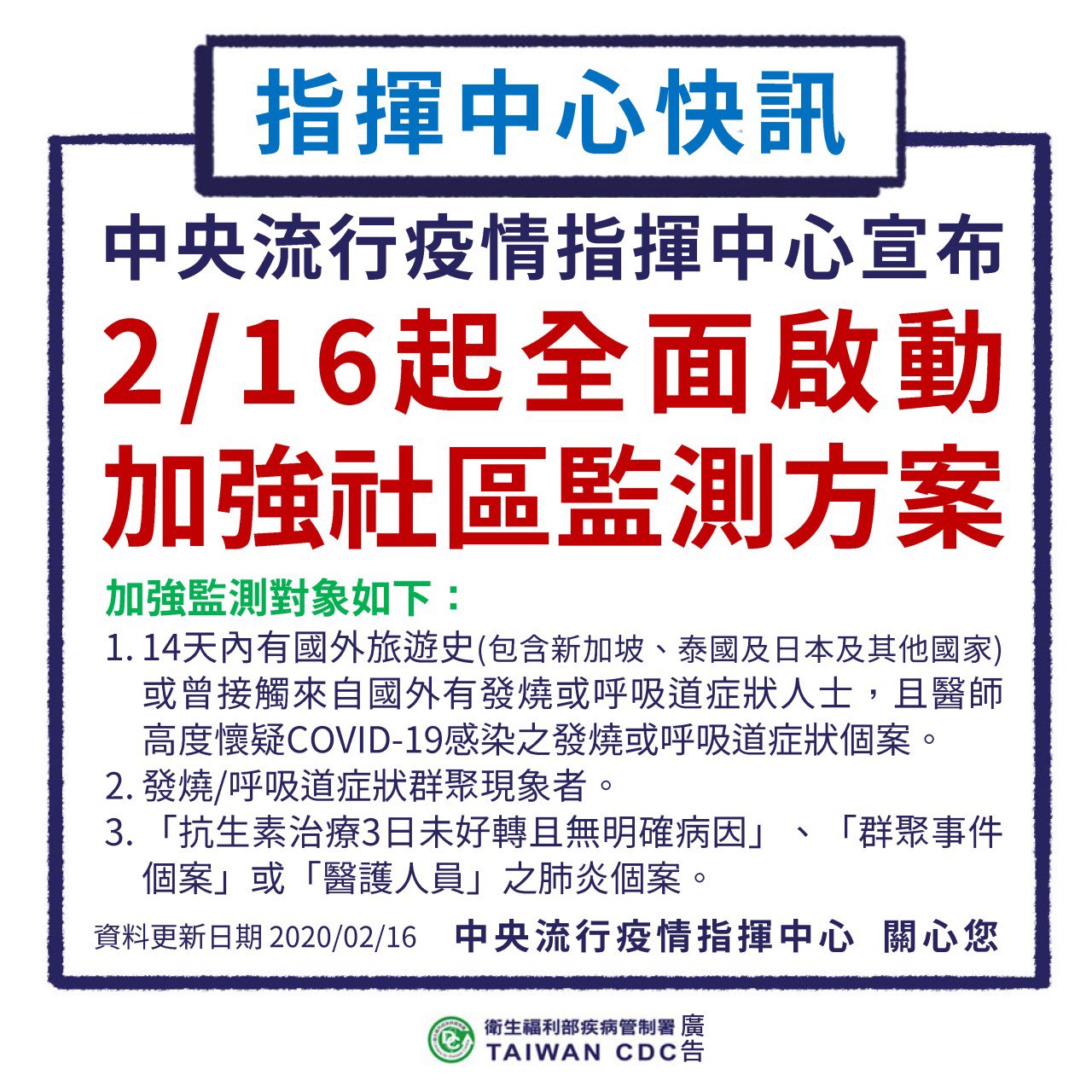 📢中央流行疫情指揮中心 今(16)日表示,因應全球COVID-19(武漢肺炎)疫情擴大,為及早發現疑似個案及防堵病毒於社區及醫療院所傳播,於今日啟動加強社區監測方案,監測對象如下︰