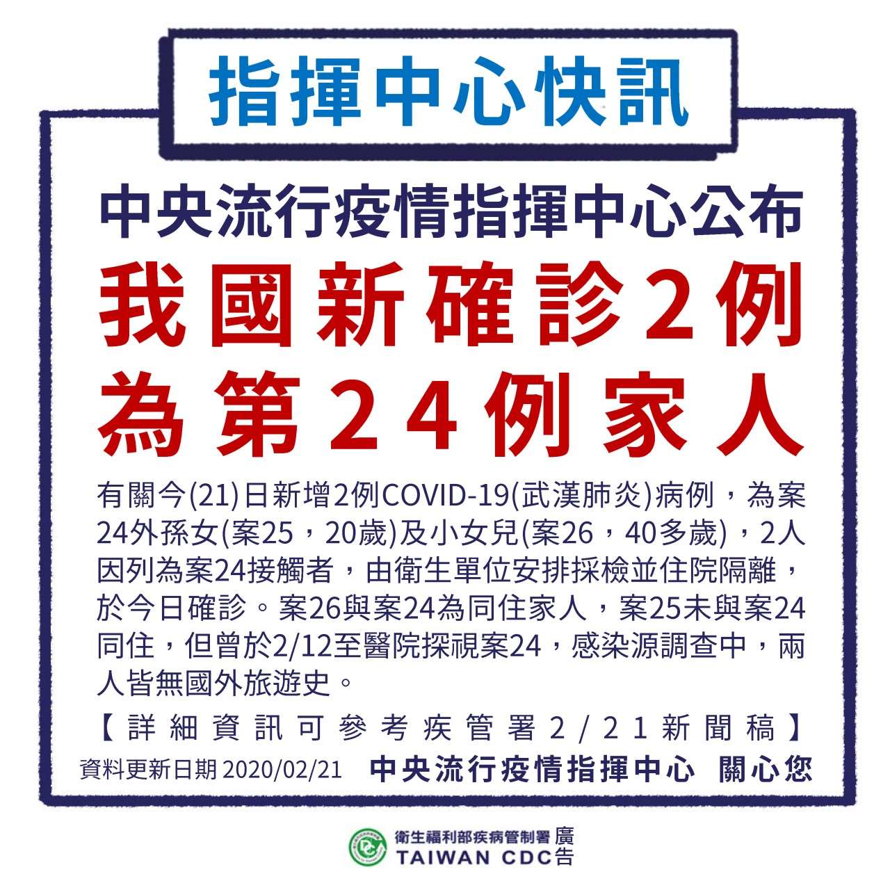 指揮中心快訊:【更正資訊】2/21國內即時疫情,新增2例武漢肺炎病例,為案24家人!