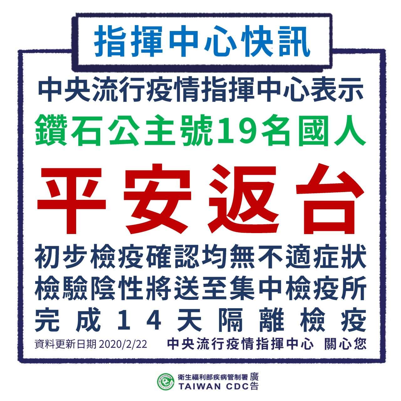 指揮中心快訊 鑽石公主號19名國人平安返台