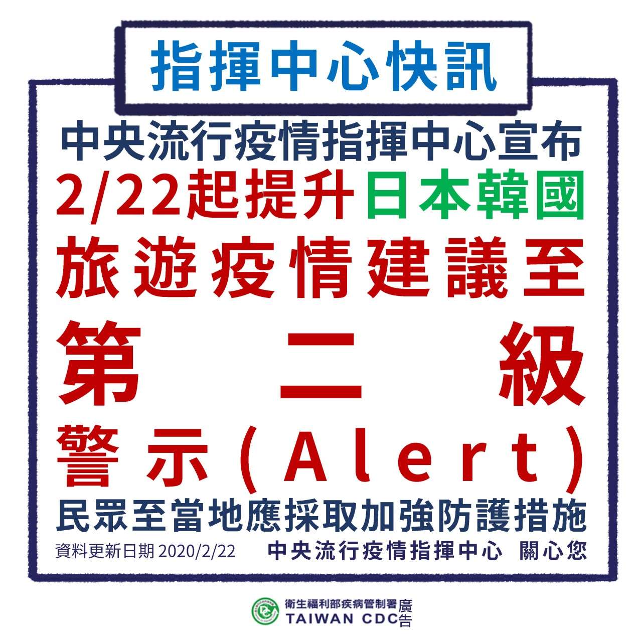 指揮中心快訊:2/22國外即時疫情,日本、韓國提升旅遊疫情建議至第二級:警示(Alert)!