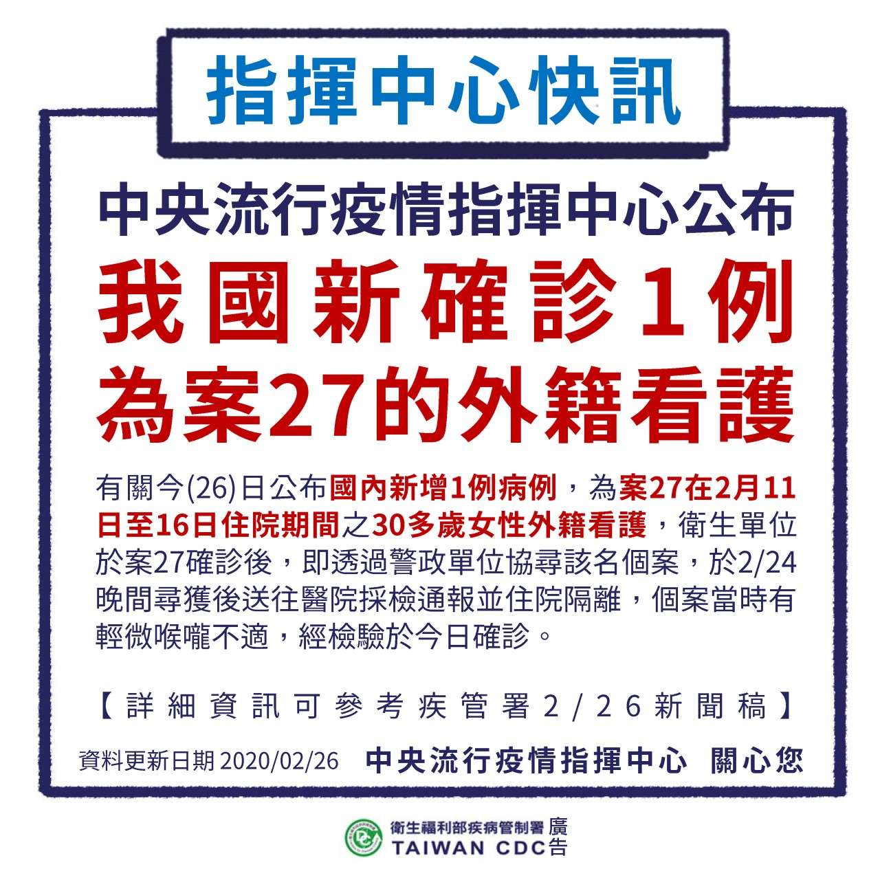 今(26)日公布國內第32例COVID-19(武漢肺炎)確定病例,為案27在2/11-2/16住院期間之30多歲女性外籍看護,衛生單位於案27確診後,即透過警政單位協尋該名個案,於2/24晚間尋獲後送往醫院採檢通報並住院隔離,個案當時有輕微喉嚨不適,經檢驗於今日確診。