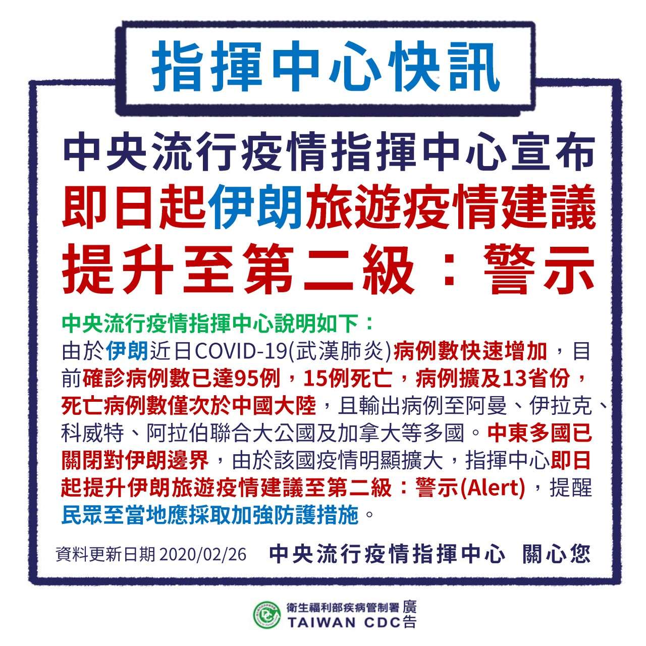 伊朗近日COVID-19(武漢肺炎)病例數及死亡病例快速增加,目前確診病例數已達95例,15例死亡,病例擴及13省份,死亡病例數僅次於中國大陸,且輸出病例至阿曼、伊拉克、科威特、阿拉伯聯合大公國及加拿大等多國。中東多國已關閉對伊朗邊界,由於該國疫情明顯擴大,指揮中心即日起提升伊朗旅遊疫情建議至第二級:警示(Alert),提醒民眾至當地應採取加強防護措施。