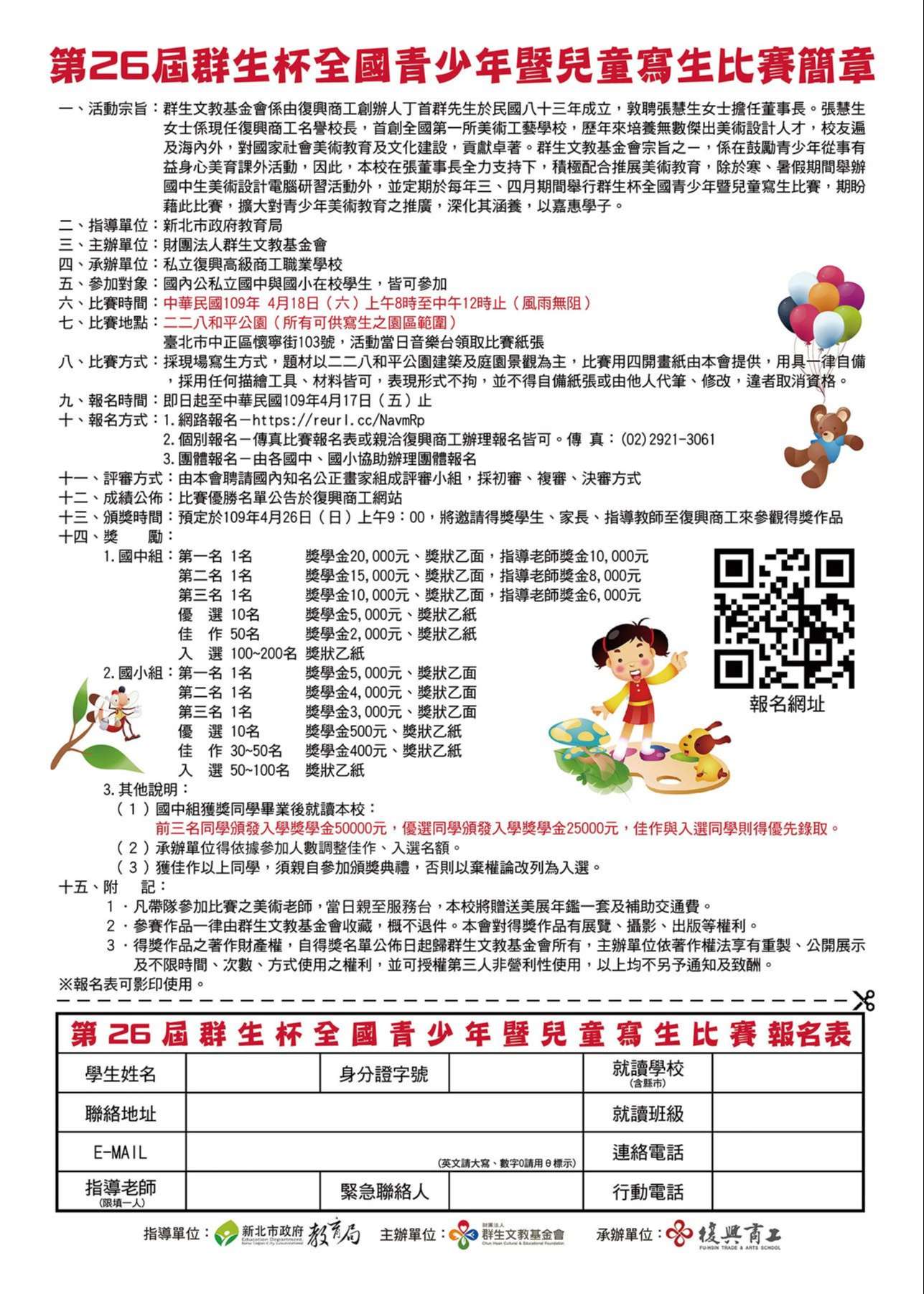 轉知新北市私立復興高級商工職業學校承辦財團法人群生文教基金會「第26屆群生杯全國青少年暨兒童寫生比賽」簡章