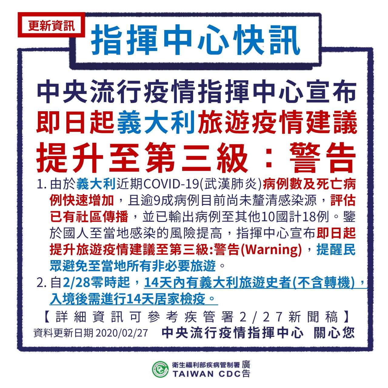 【更新資訊】指揮中心快訊:義大利旅遊疫情升至第三級警告;自2/28零時起,入境時14天內有義大利旅遊史者,需居家檢疫14天!