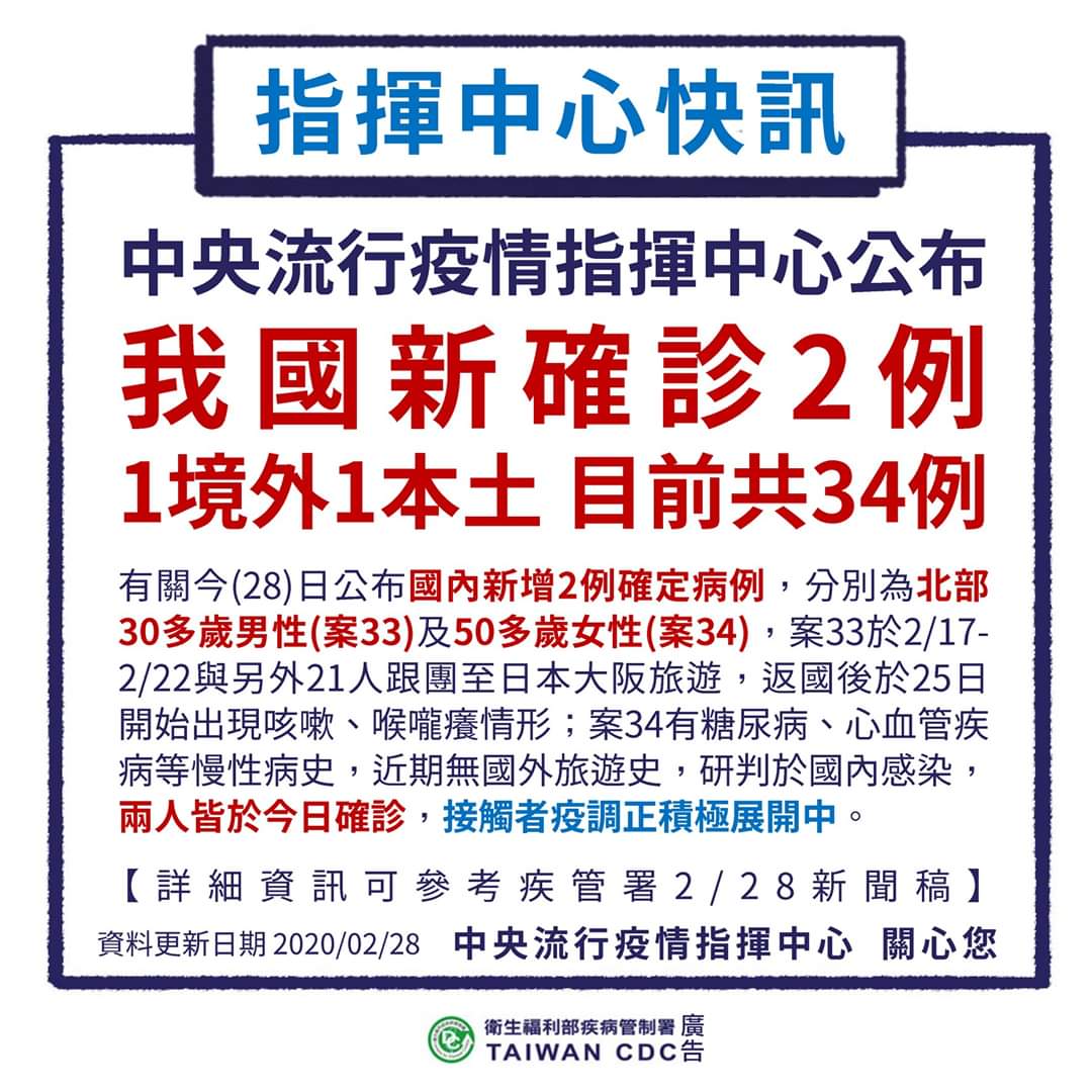 今(28)日公布國內新增2例COVID-19(武漢肺炎)確定病例,分別為北部30多歲男性(案33)及50多歲女性(案34),其中案33於2月17日至22日與另外21人跟團至日本大阪旅遊,返國後於25日出現咳嗽、喉嚨癢情形,因症狀持續,於26日至醫院急診就醫採檢後返家,27日醫院通報送驗,於今日確診,目前個案已由衛生單位安排收治負壓隔離病房治療;依個案活動史研判,於日本感染的可能性較高,為境外移入個案。