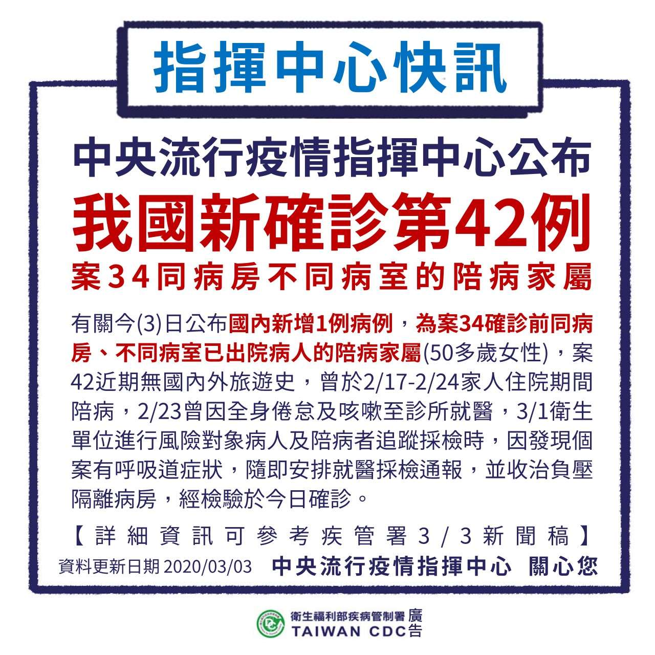 指揮中心快訊:3/3新增第42例為案34同病房不同病室的陪病家屬!
