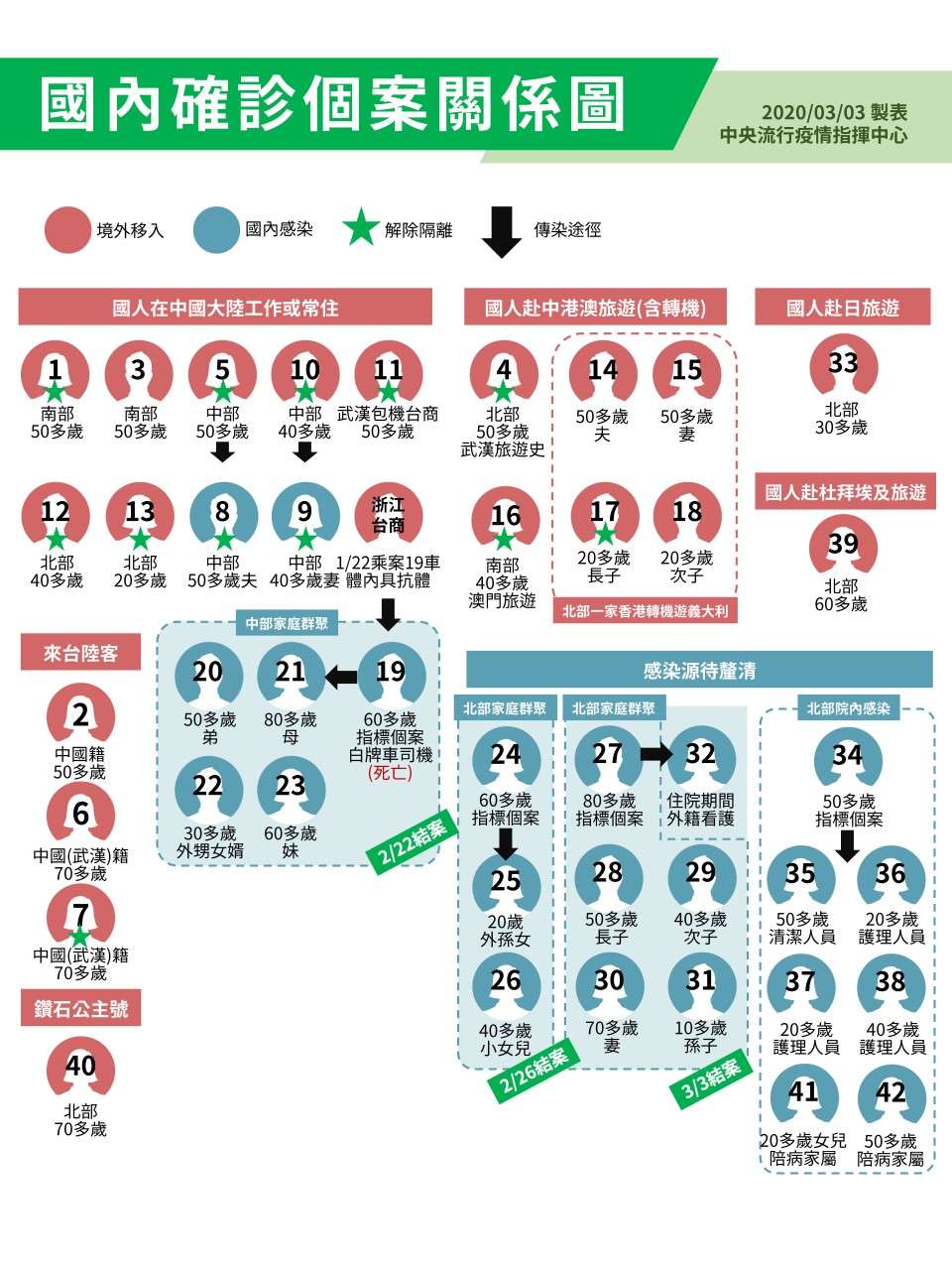 附件為截至3/3國內42例確診個案的關係圖,提供大家釐清目前疫情的狀況!