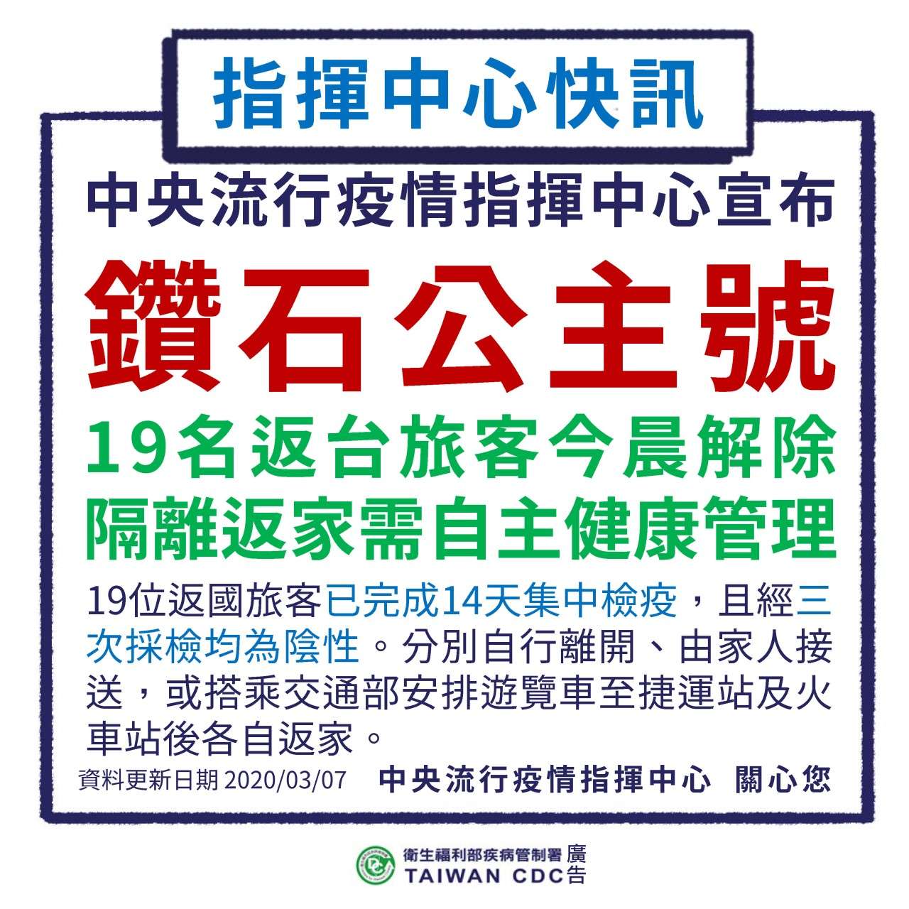 🔔鑽石公主號 19位返國旅客已完成14天集中檢疫,且經三次採檢均為陰性,於今日解除隔離。其中12人自行離開或由家人接送,7人於上午10點搭乘交通部安排的遊覽車至捷運站及火車站後各自返家;所有人返家後需進行自主健康管理。