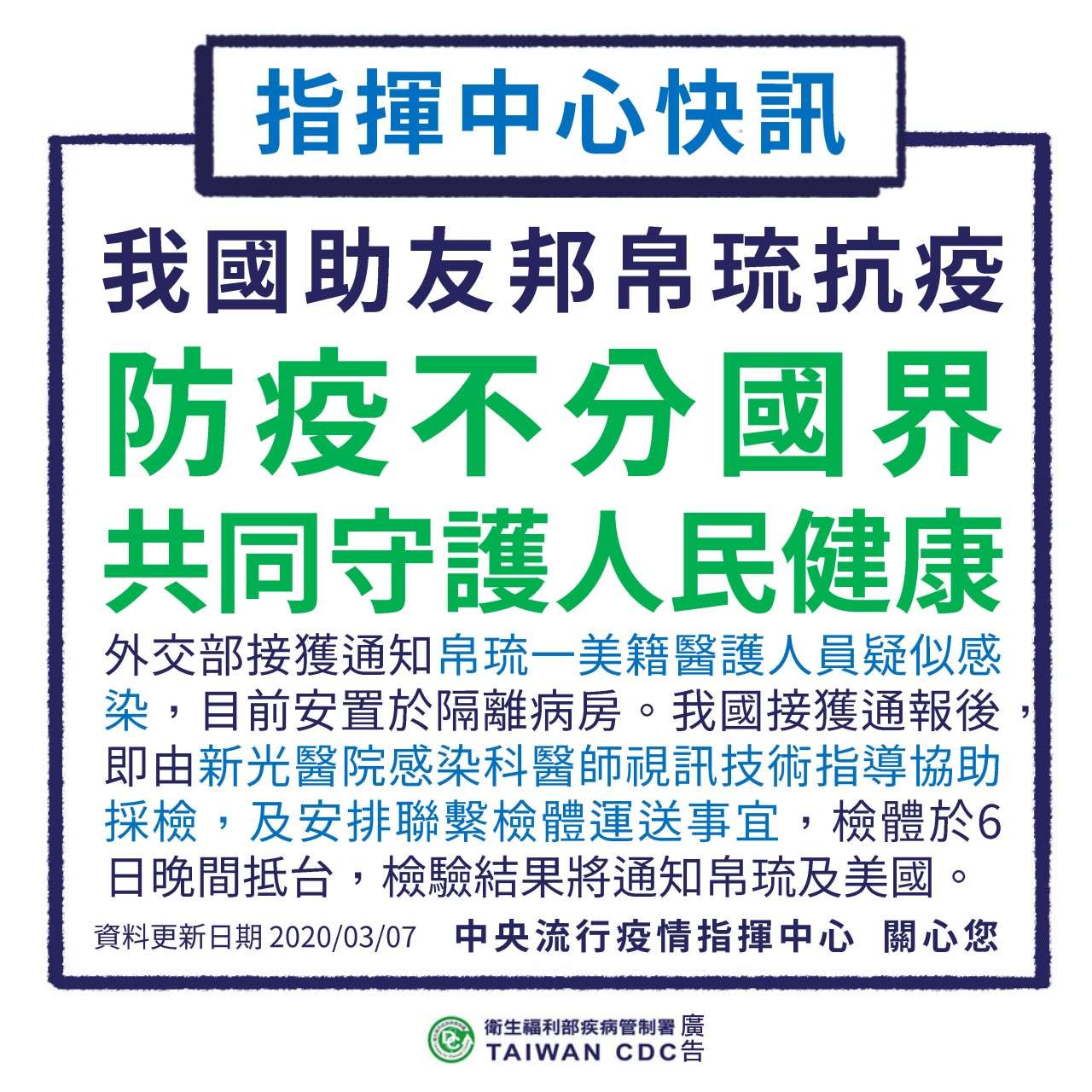 外交部接獲帛琉官方通知,該國發現一名駐帛琉美籍醫護人員疑似感染COVID-19(武漢肺炎),目前已將其安置於隔離病房。我國第一時間接獲通報後,即由新光醫院感染科醫師透過視訊技術指導協助採檢,及安排聯繫檢體運送事宜;檢體已於昨(6)日晚間抵台,並由專人送至疾管署實驗室檢驗,後續檢驗結果將通知帛琉及美國。