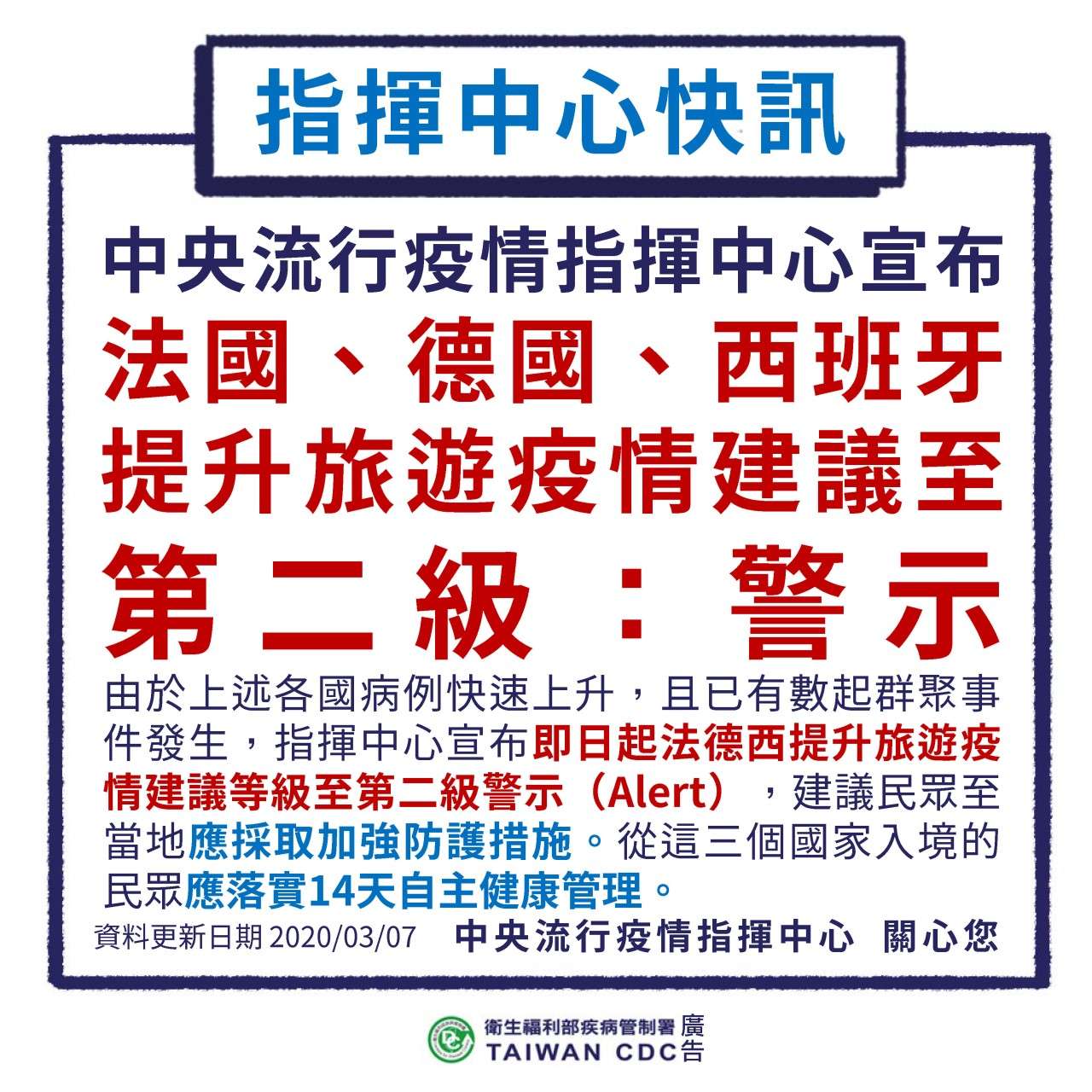 🌏 指揮中心目前將中國大陸(含港澳)、韓國、義大利、伊朗列為旅遊疫情建議第三級警告;日本、新加坡、法國、德國、西班牙列第二級警示;泰國列第一級注意。