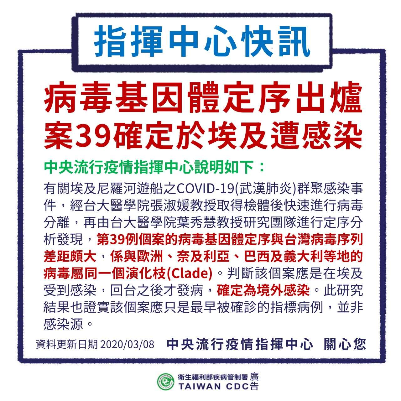 指揮中心快訊:3/8病毒基因體定序出爐,確定案39於埃及遭感染!