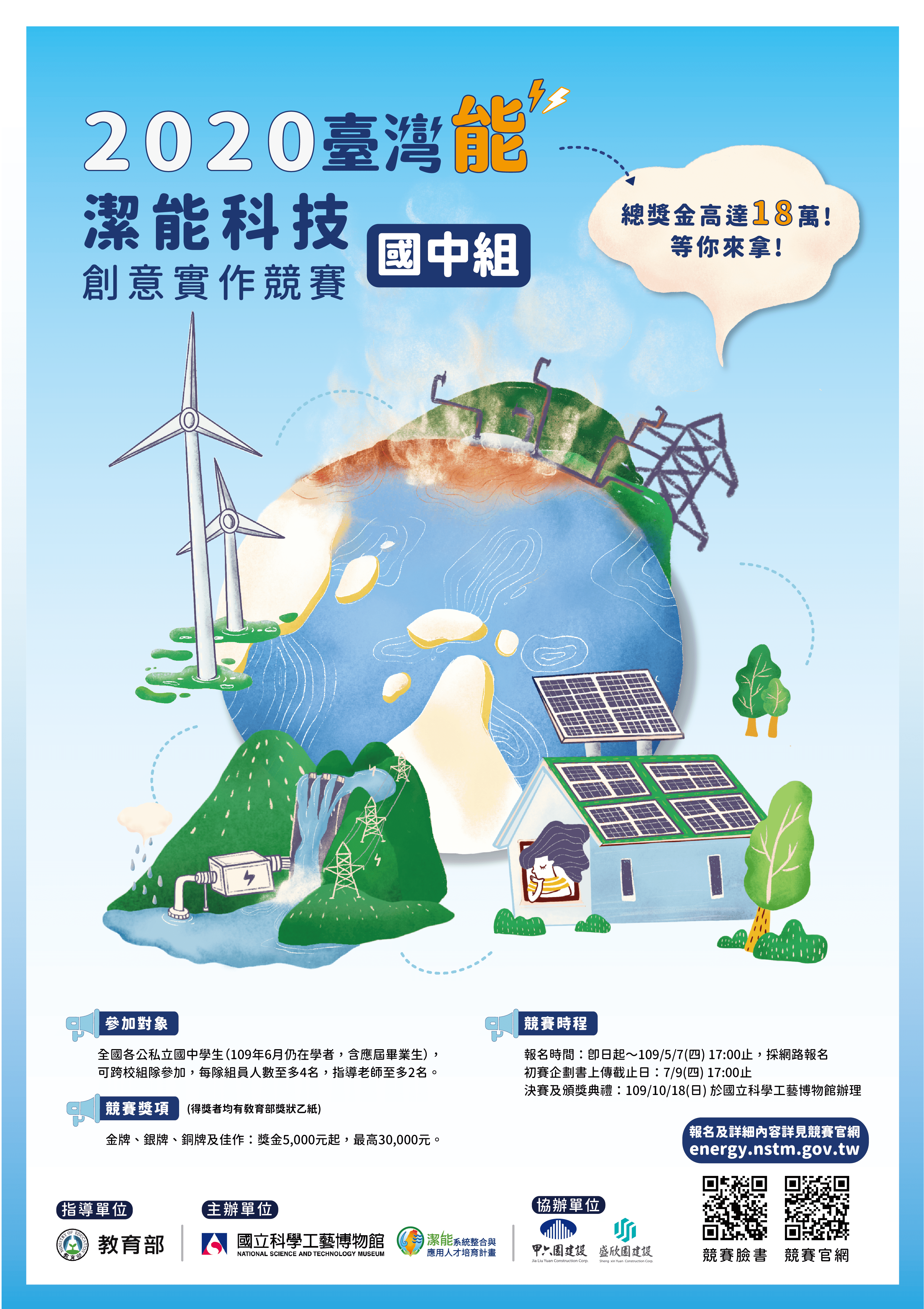 一、本競賽係由教育部指導,本館與教務部潔能系統整合與應用人才培育計畫辦公室共同主辦,以潔淨及創新能源、儲能、能源有效化利用、綠能循環經濟、節能等與「能源科技」相關之主題,邀請全國國中學生組隊參加,在生活中確實展開珍惜能源,愛護環境的行動。