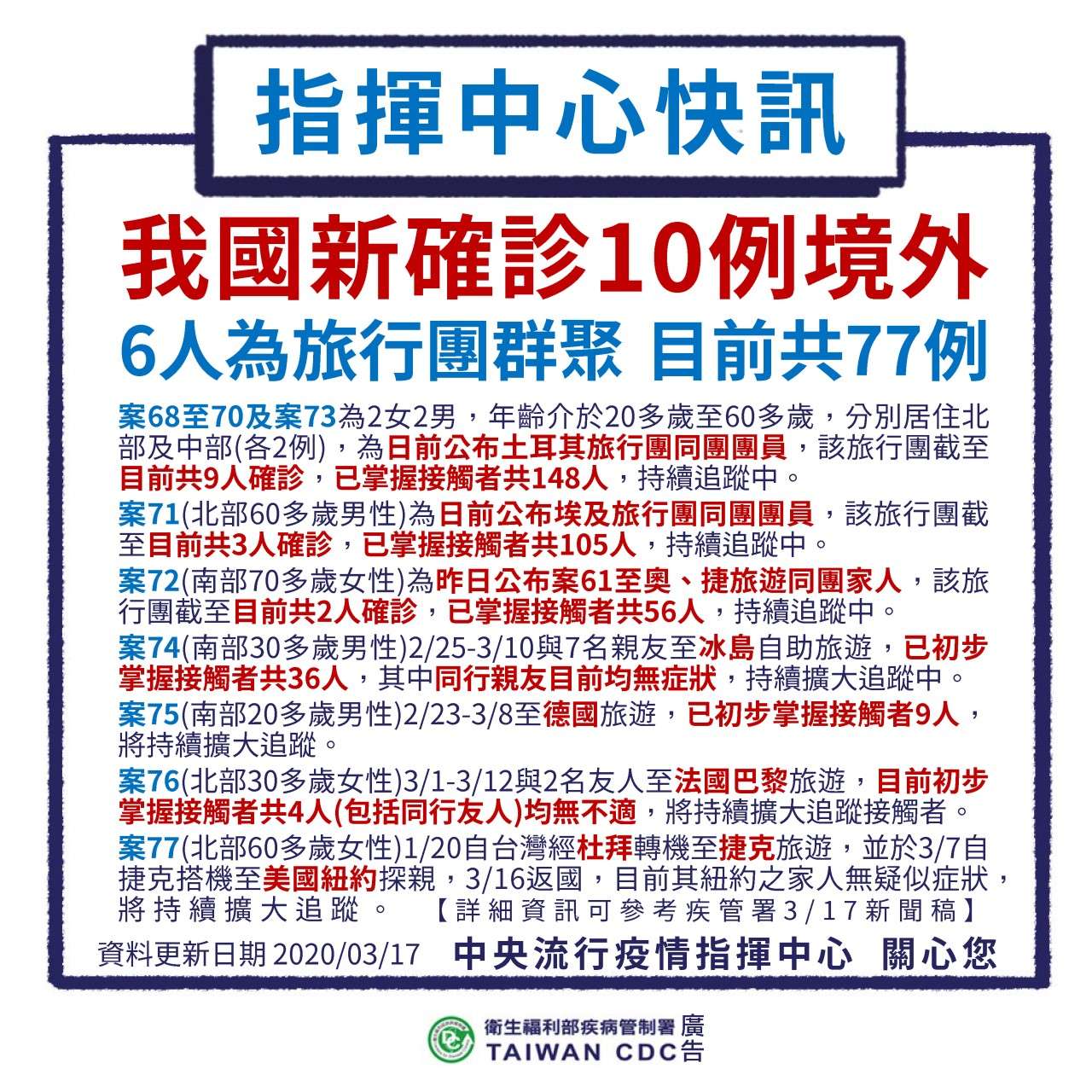 指揮中心快訊:3/17國內即時疫情,新增10例境外移入,目前我國共77例!