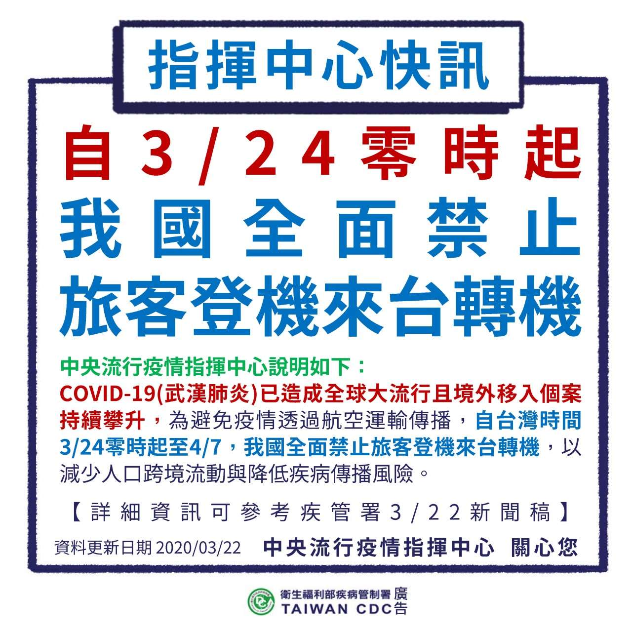 指揮中心3/22表示,COVID-19(武漢肺炎)疫情已造成全球大流行且境外移入個案持續攀升,為避免疫情透過航空運輸傳播,自台灣時間3/24零時起至4/7,我國全面禁止旅客登機來台轉機,以減少人口跨境流動與降低疾病傳播風險。