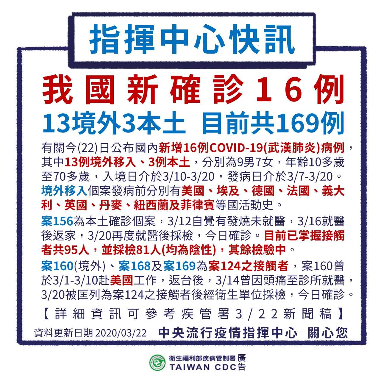 指揮中心快訊:3/22國內外即時疫情,新增13例境外、3例本土,目前我國共169例!