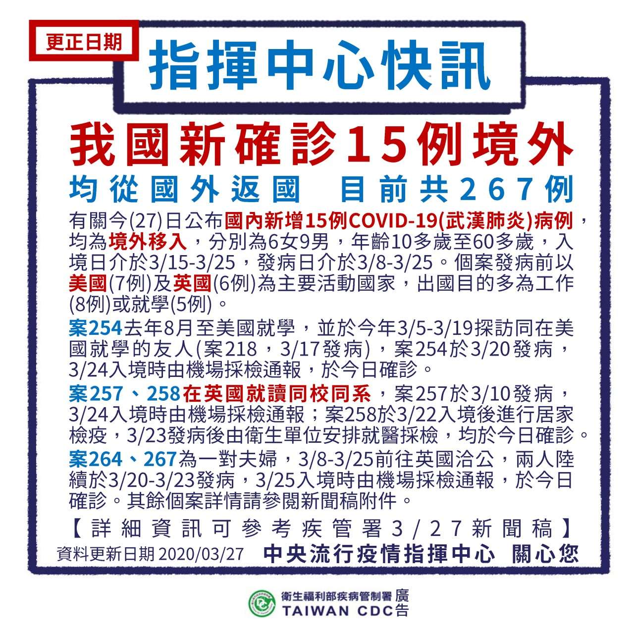 指揮中心快訊:3/27國內外即時疫情,新增15例境外,目前我國共267例!