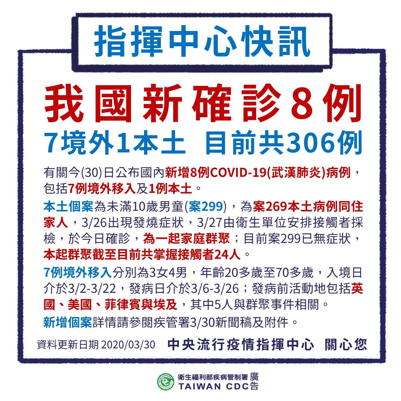 國內目前累計306例確診(今日新增案299至306),分別為262例境外移入及44例本土病例。確診個案中5人死亡,39人解除隔離,其餘持續住院隔離中。