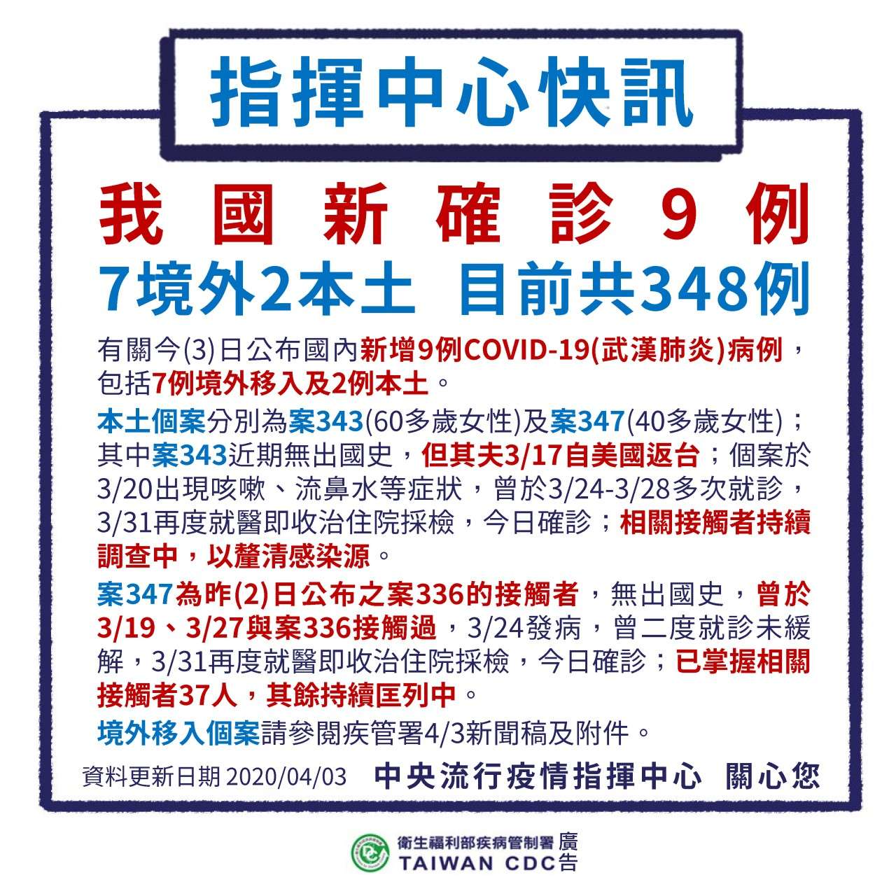 今(3)日公布國內新增9例COVID-19(武漢肺炎)病例(案340至348),其中7例境外移入及2例本土。