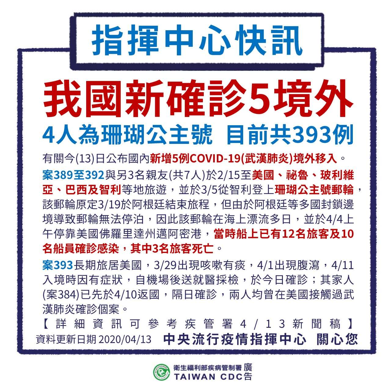 今(13)日公布國內新增5例COVID-19(武漢肺炎)病例,均為境外移入,其中4人為珊瑚公主號旅客。