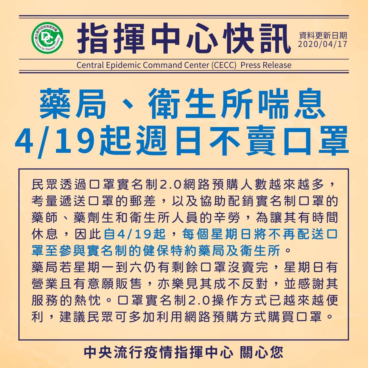 中央流行疫情指揮中心今(17)日表示,民眾透過口罩實名制2.0網路預購人數越來越多,考量遞送口罩的郵差,以及協助配銷實名制口罩的藥師、藥劑生和衛生所人員的辛勞,為讓其有時間休息,因此自4/19起,每個星期日將不再配送口罩至參與實名制的健保特約藥局及衛生所。