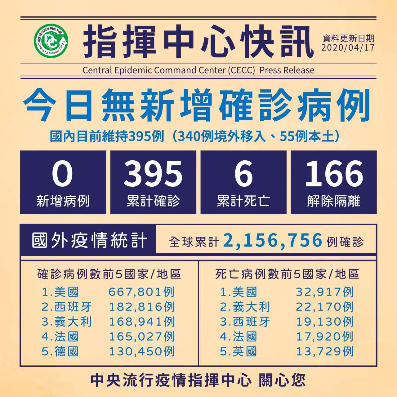 今(17)日無新增確診病例,國內維持395例確診,分別為340例境外移入及55例本土病例。確診個案中6人死亡,166人解除隔離,其餘持續住院隔離中。