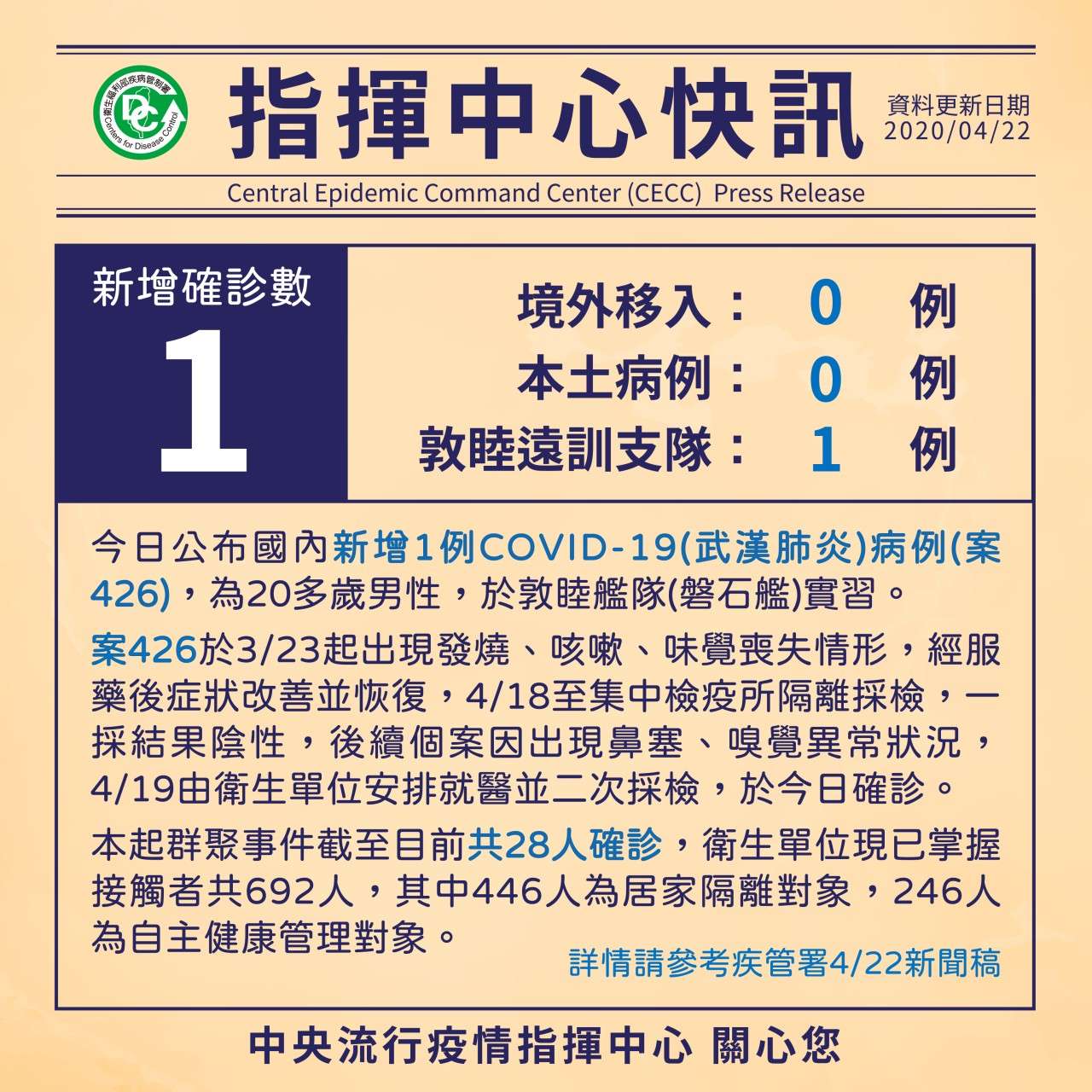 今(22)日公布國內新增1例COVID-19(武漢肺炎)病例(案426),為20多歲男性,於敦睦艦隊(磐石艦)實習。