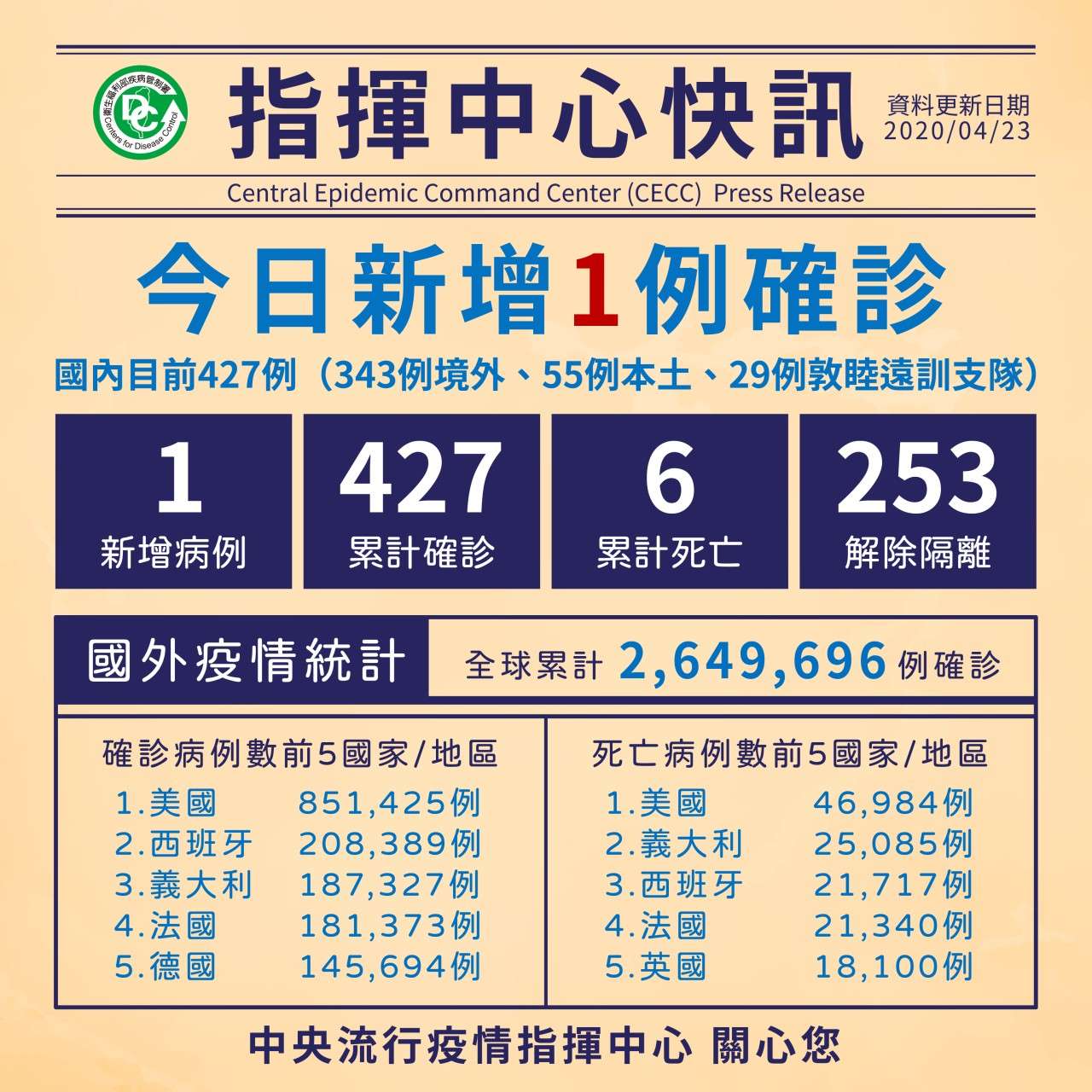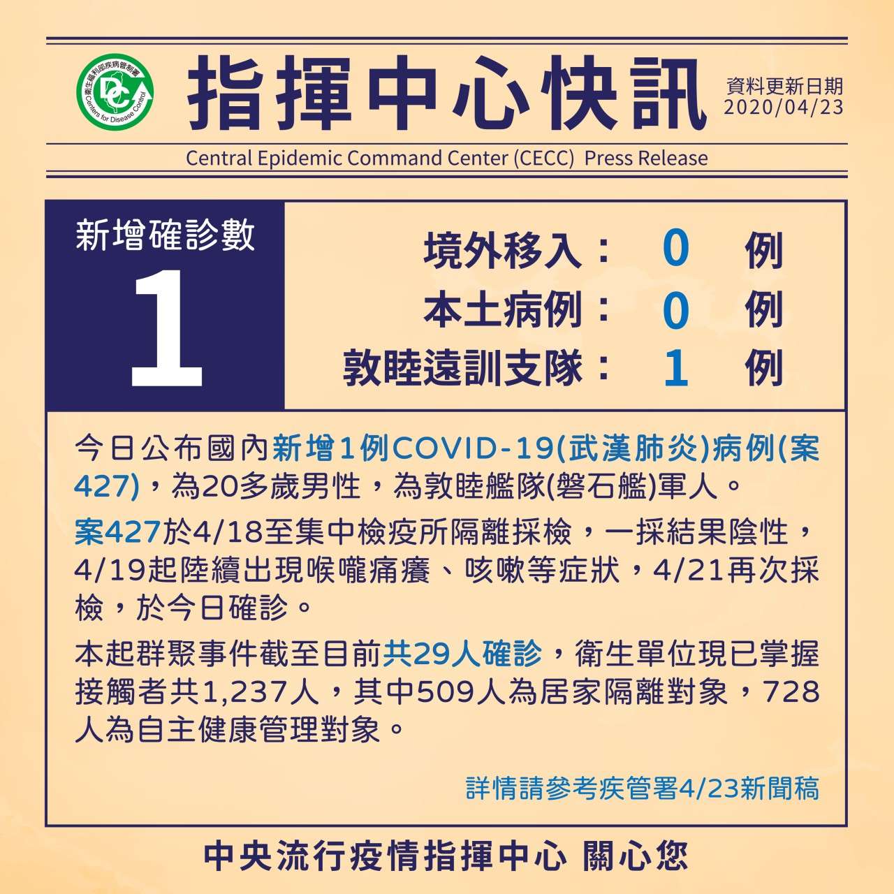 今(23)日公布國內新增1例COVID-19(武漢肺炎)病例(案427),為20多歲男性,為敦睦艦隊(磐石艦)軍人。