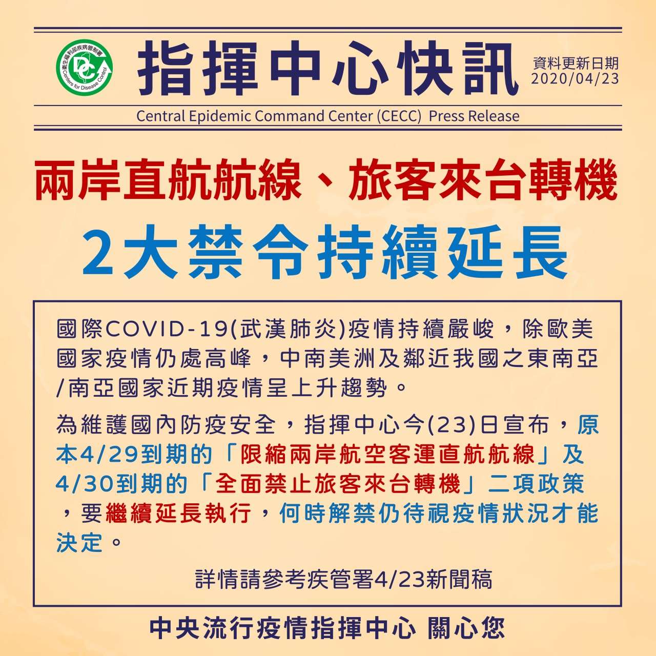 指揮中心快訊:延長2禁令!「兩岸直航航線」及「旅客來台轉機」繼續禁!
