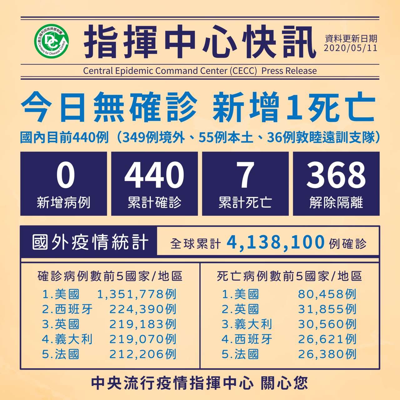國內維持440例確診,分別為349例境外移入,55例本土病例及36例敦睦艦隊。確診個案中7人死亡,368人解除隔離,其餘持續住院隔離中。