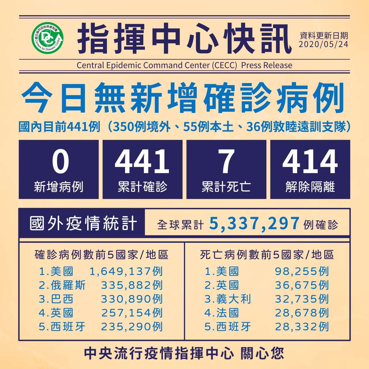 今(24)日無新增確診病例,國內維持441例確診,分別為350例境外移入,55例本土病例及36例敦睦艦隊。確診個案中7人死亡,414人解除隔離,其餘持續住院隔離中。