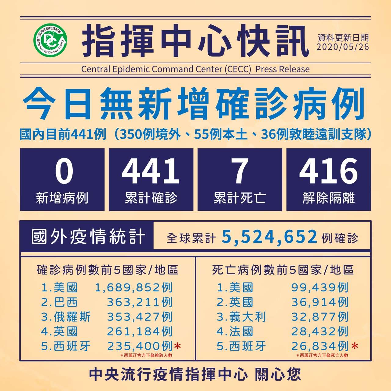 今(26)日無新增確診病例,國內維持441例確診,分別為350例境外移入,55例本土病例及36例敦睦艦隊。確診個案中7人死亡,416人解除隔離,其餘持續住院隔離中。