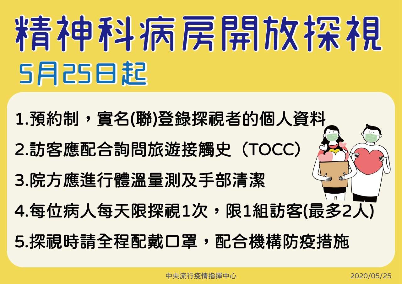 因應國內疫情平穩,社區內相對安全,將逐步適度放寬防疫措施。考量精神科病房平均住院天數較長,為減少病患情緒起伏,自今(25)日起,放寬精神科病房探視,辦理方式如下: