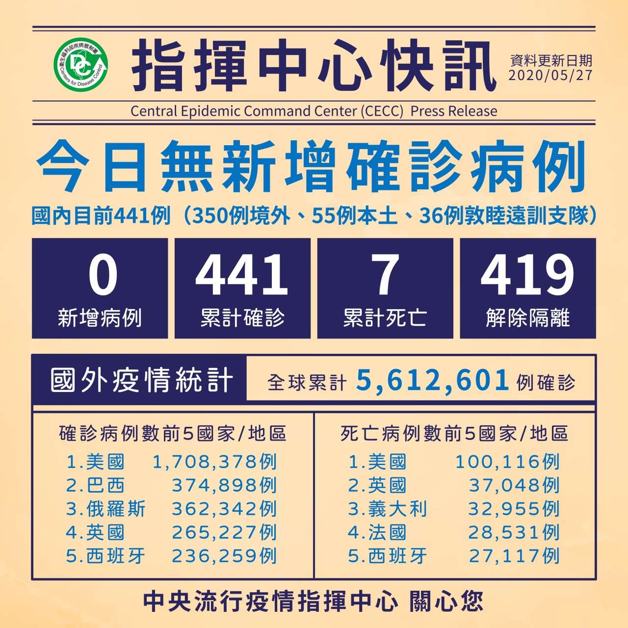 今(27)日無新增確診病例,國內維持441例確診,分別為350例境外移入,55例本土病例及36例敦睦艦隊。確診個案中7人死亡,419人解除隔離,其餘持續住院隔離中。