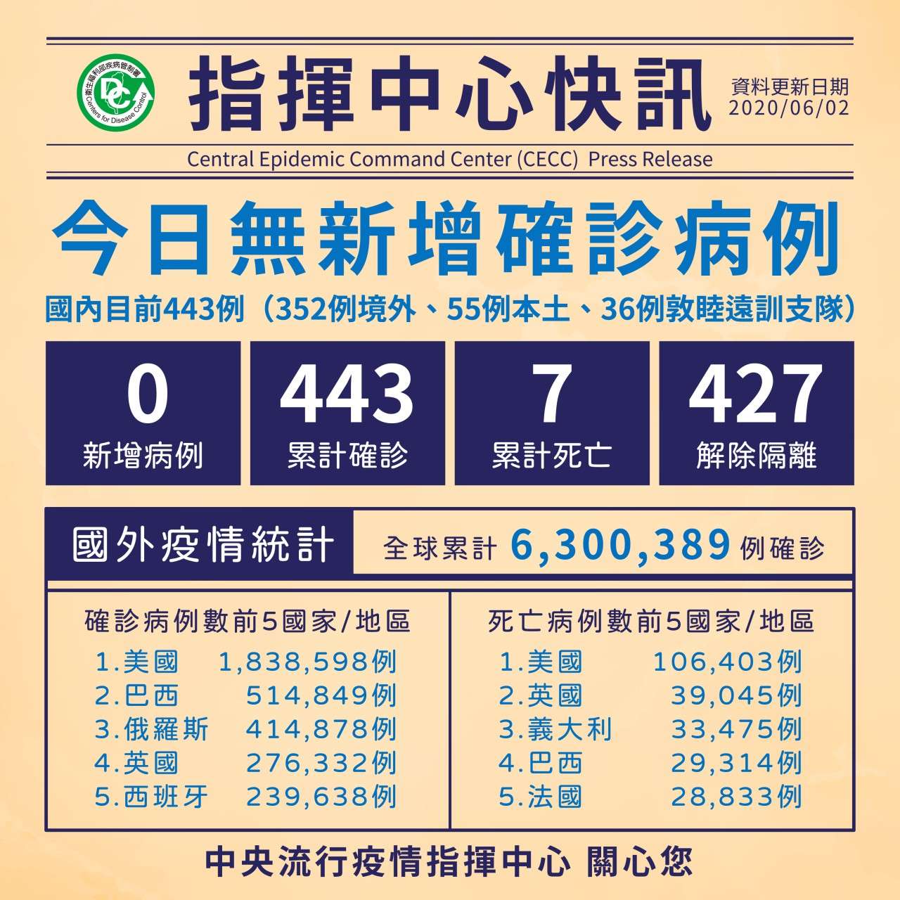 指揮中心快訊:6/2國內外疫情統計!