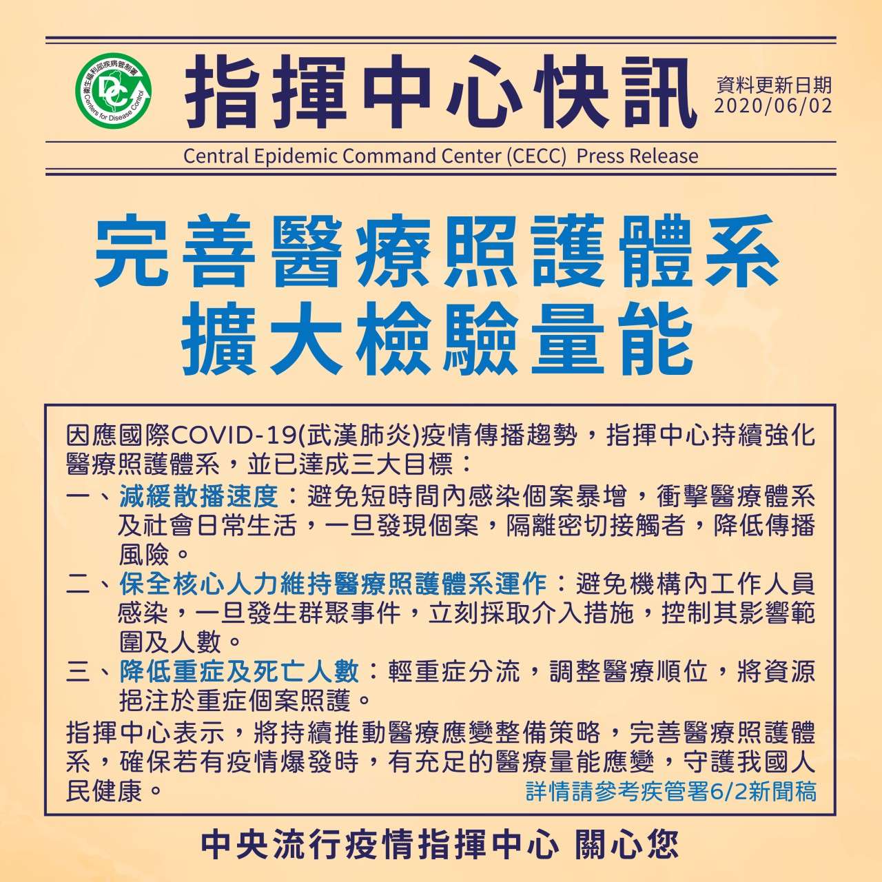 指揮中心快訊:完善醫療照護體系並擴大檢驗量能,守護國人健康!