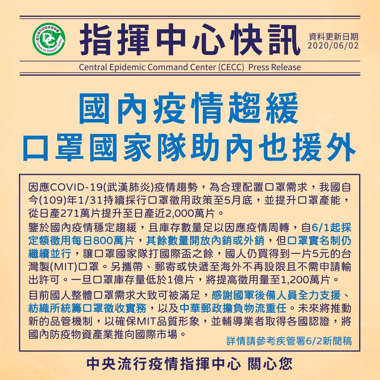 指揮中心快訊:國內疫情趨緩,口罩國家隊助內也援外!
