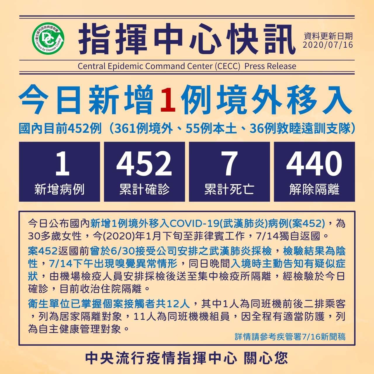 中央流行疫情指揮中心今(16)日公布國內新增1例境外移入COVID-19(武漢肺炎)病例(案452),為30多歲女性,今年1月下旬至菲律賓工作,7/14獨自返國。