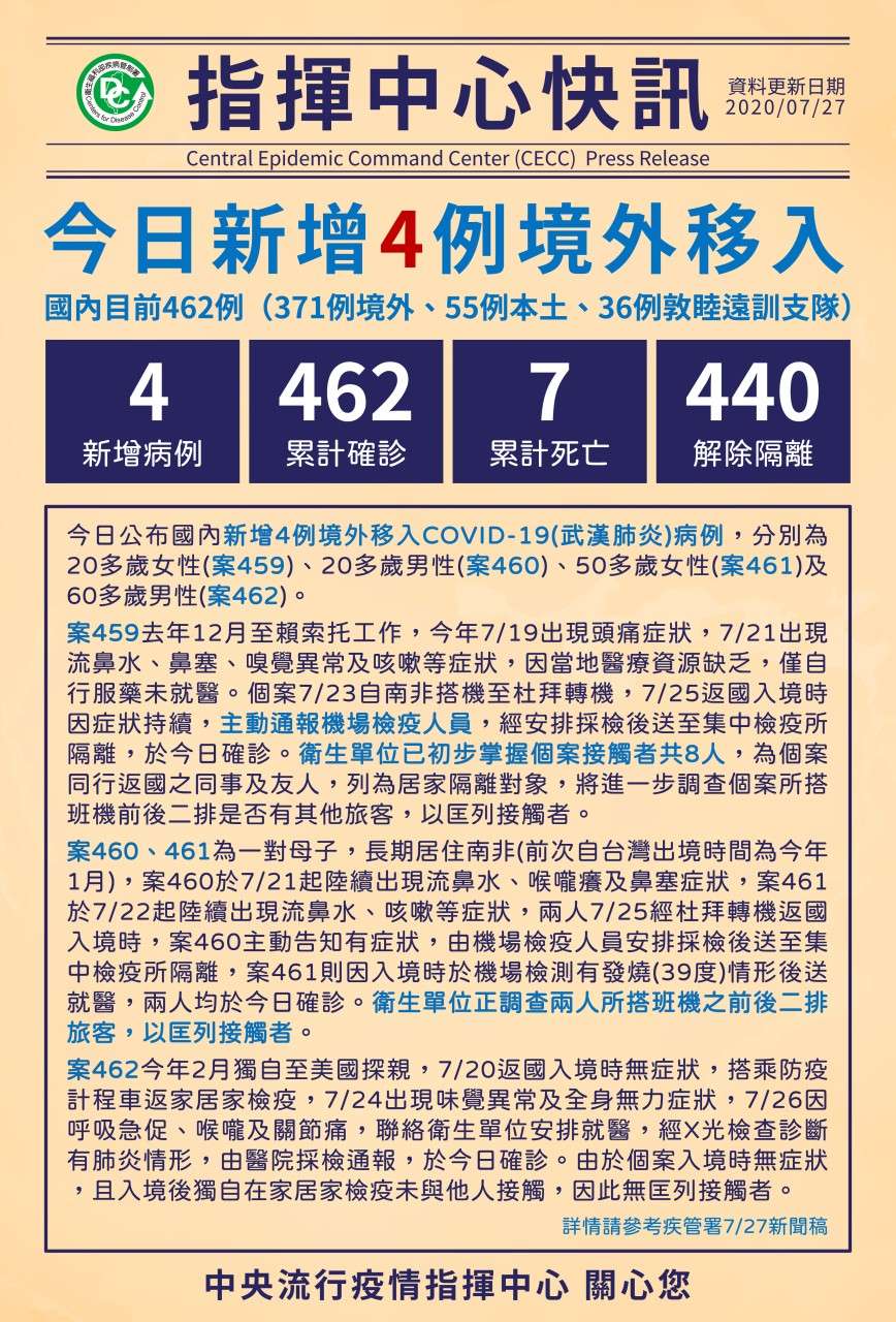 中央流行疫情指揮中心今(27)日公布國內新增4例境外移入COVID-19(武漢肺炎)病例,分別為20多歲女性(案459)、20多歲男性(案460)、50多歲女性(案461)及60多歲男性(案462)。