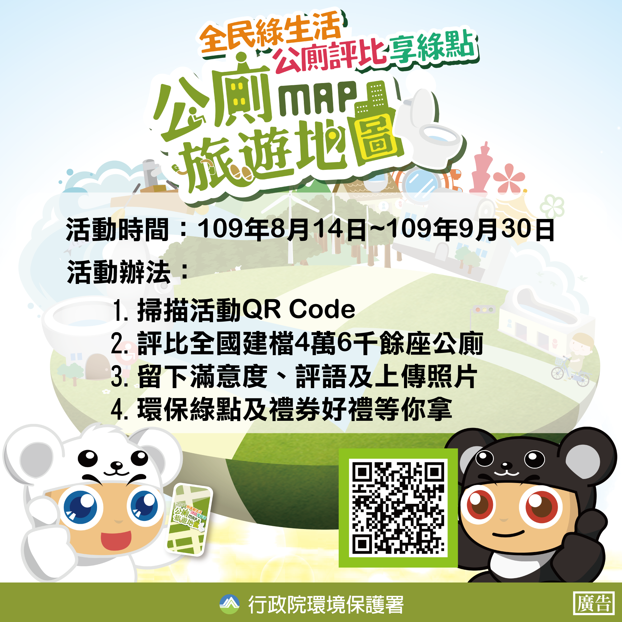 為持續推動優質公廁,環保署及各級環保機關已將全國4萬餘座公廁建檔,並透過巡查要求公廁管理單位落實清潔維護工作。然而良好如廁習慣養成也是公廁清潔維護重點,環保署規劃辦理「全民綠生活 公廁評比享綠點」活動,透過公廁評比活動,呼籲全民眾重視公廁維護重要性。