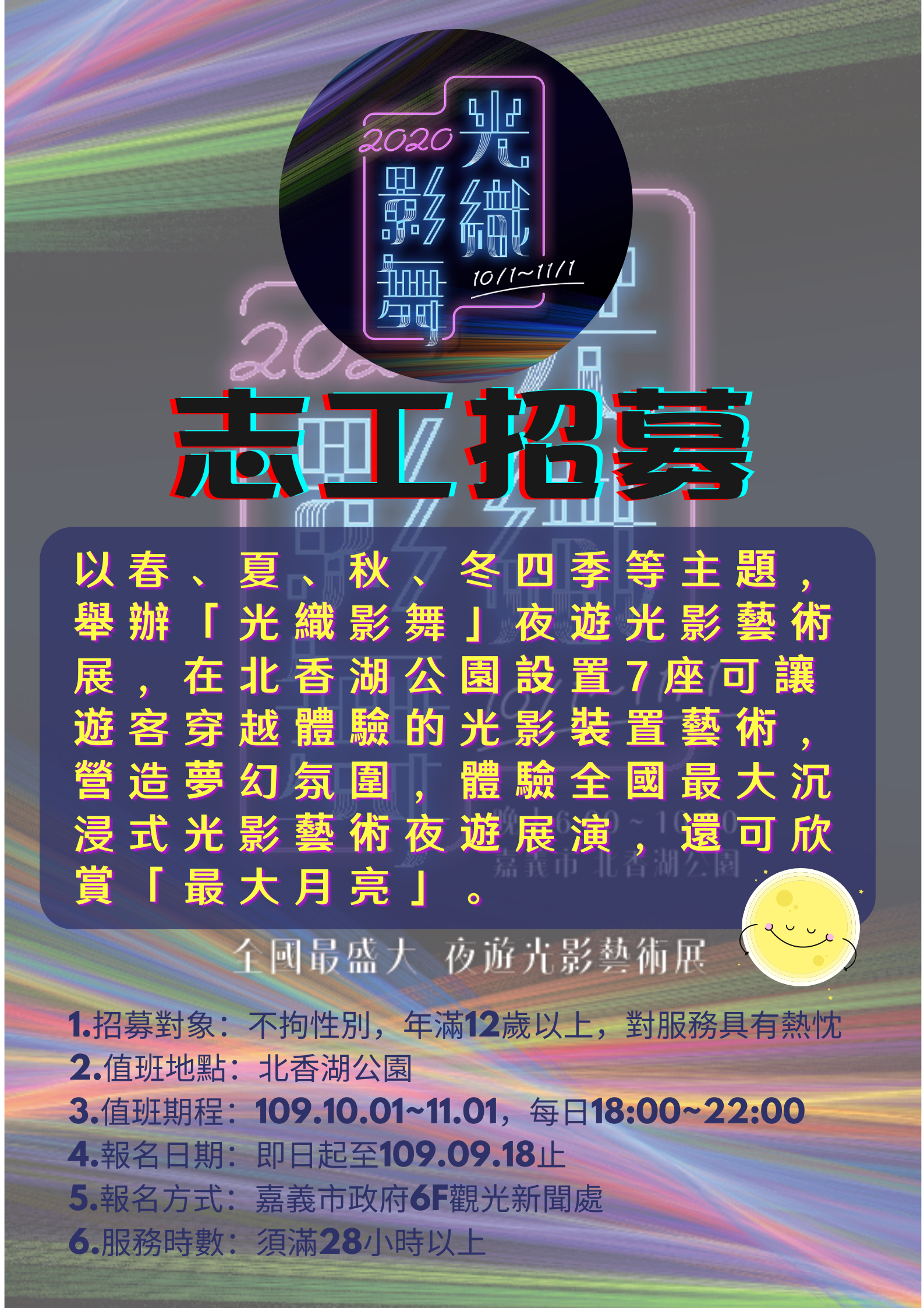 嘉義市於109年10月1日至11月1日於北香湖辦理「2020光織影舞-夜遊光影藝術展」,相關志工召募海報及報名表如附件,有意報名者請自行參閱。