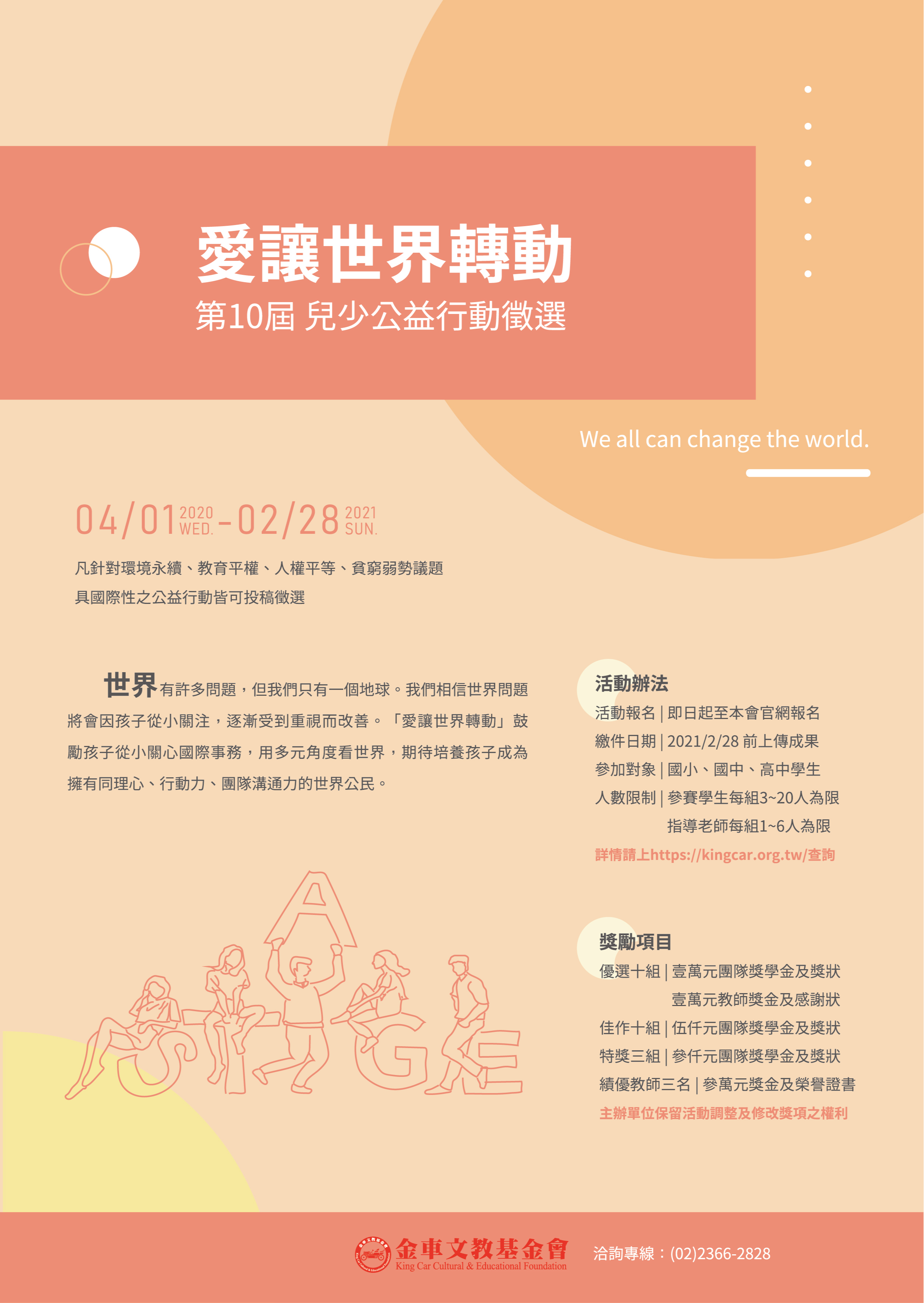 二、「愛讓世界轉動 兒少公益行動」徵選資訊(一)活動對象:國小、國中、高中之學生,團隊人數(3人~20人),以班級、社區、家庭為單位報名。
