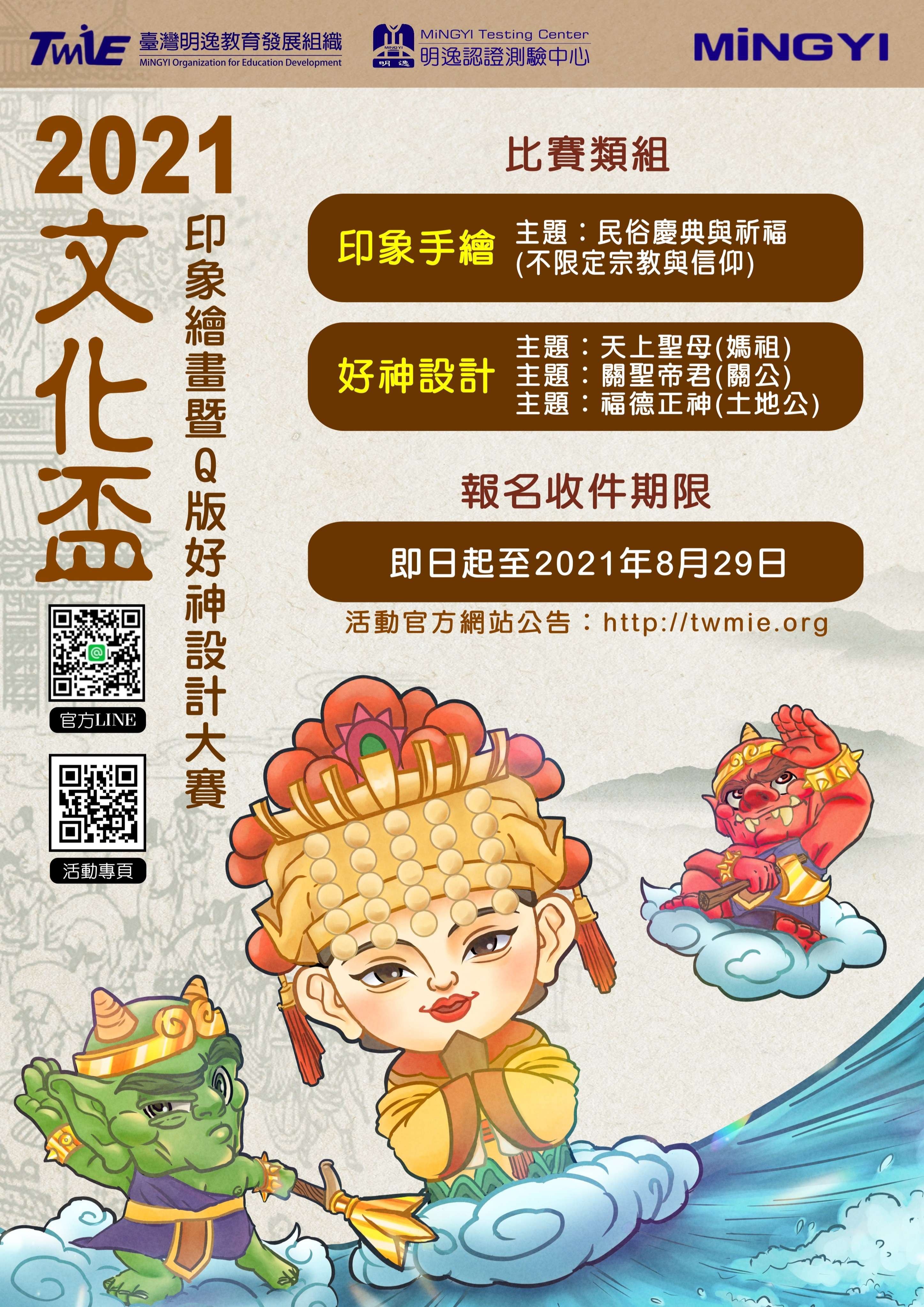一、旨揭「2021 MiNGYI 文化盃印象繪畫暨Q版好神設計大賽(下稱:本競賽),本競賽鼓勵學子以電腦或手繪方式創作,透過不同主題表現宗教文化建築、神像、文物、民俗活動或慶典之美,藉由本活動發想創作提升民眾宗教文化藝文素質。相關說明如下: