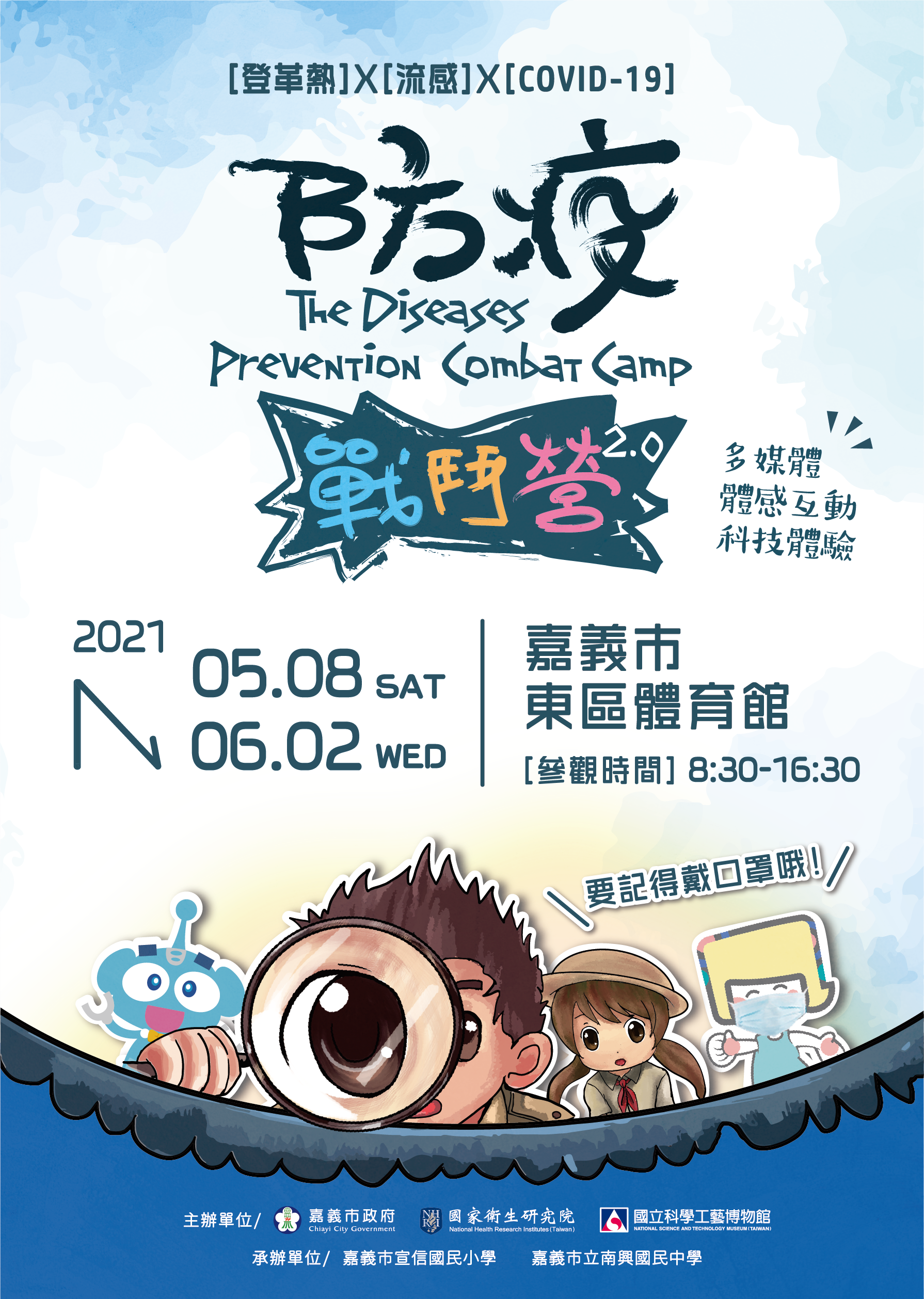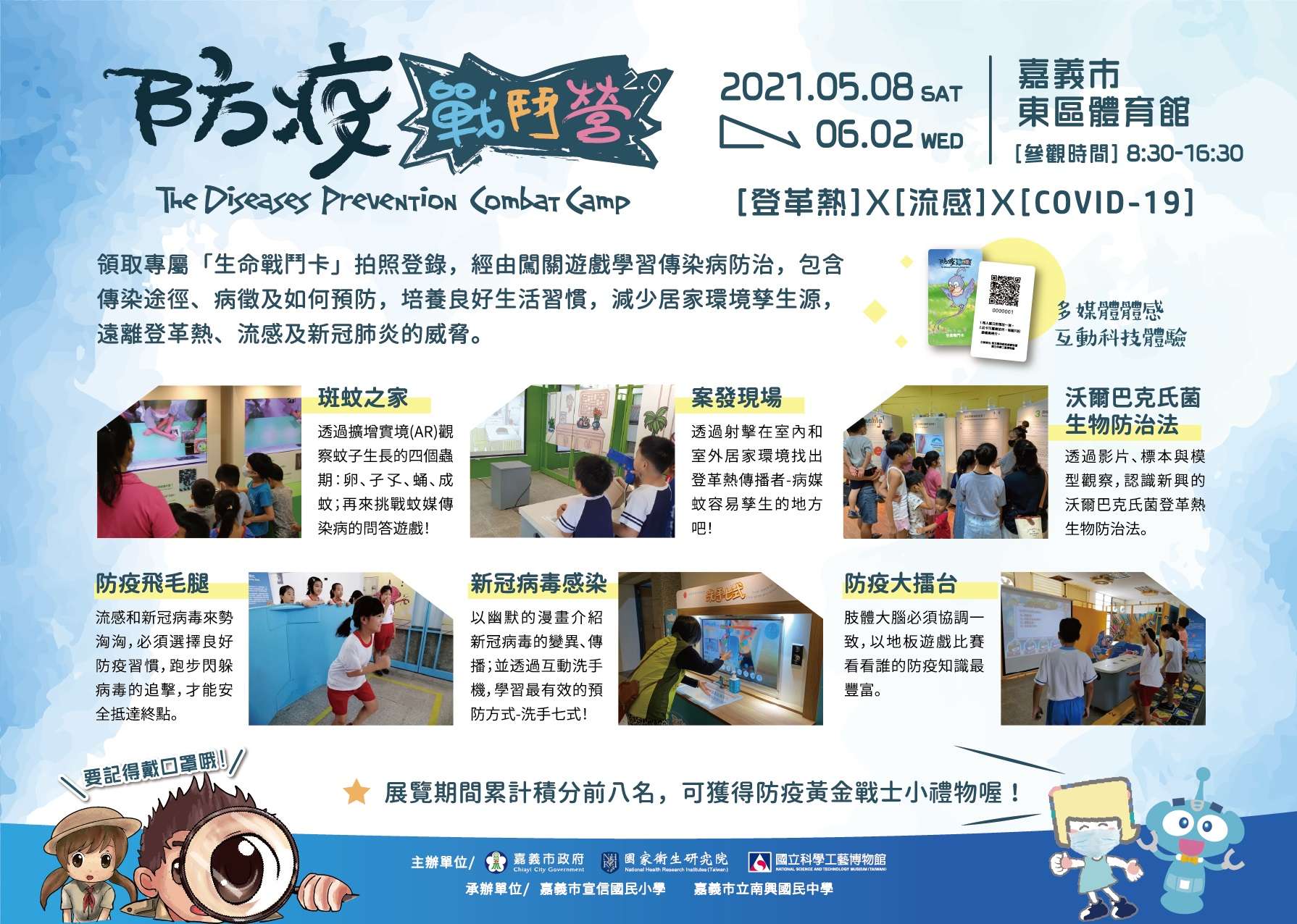 二、特展110年5月8日至6月2日於嘉義市東區體育館展出,以高互動體驗搭配遊戲闖關,及寓教於樂的多媒體互動科技展示手法,介紹登革熱、流感及新冠肺炎等傳染病,請鼓勵學生及家長踴躍觀展。