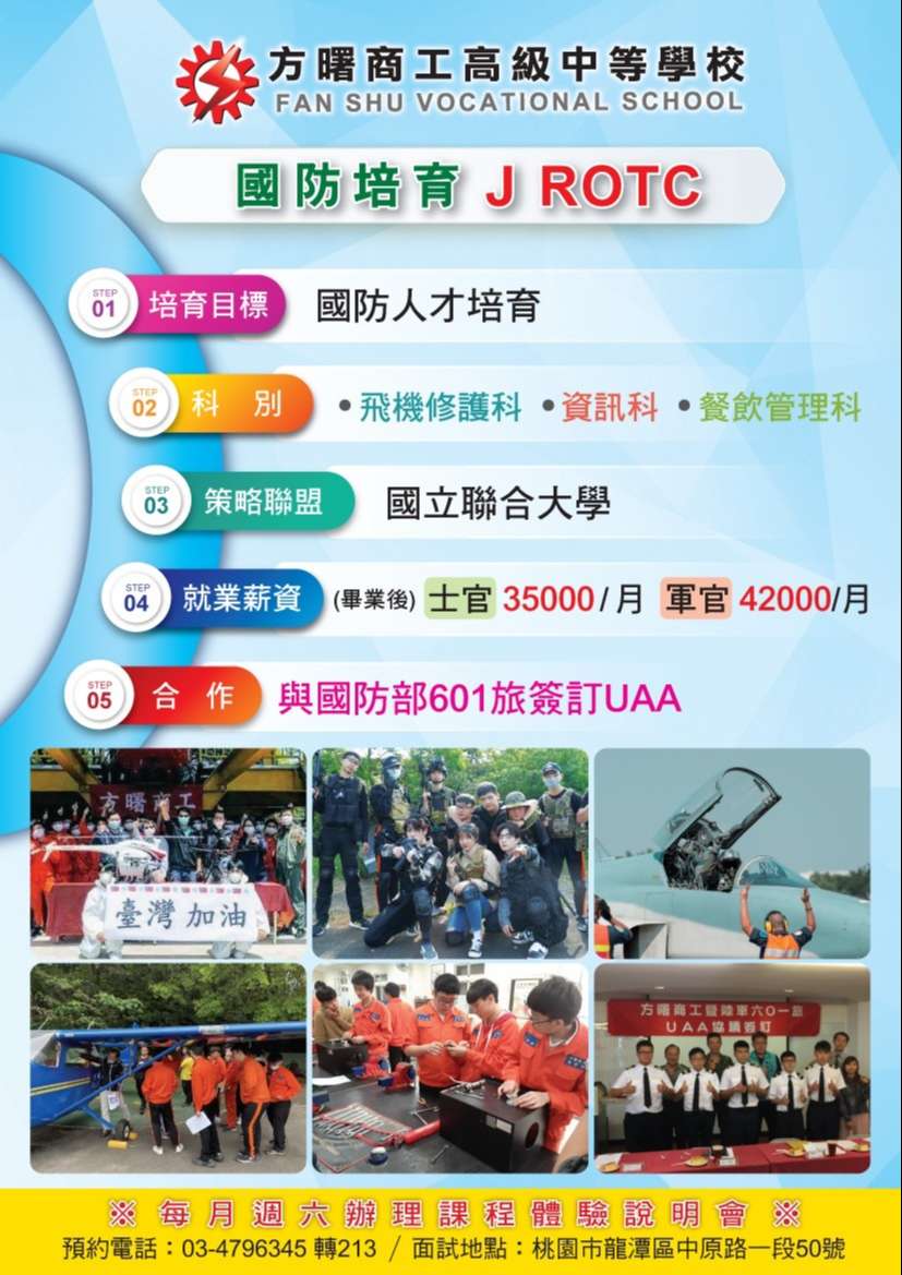 三、為更進一步讓學生了解國防培育班特色,線上說明影音檔https://reurl.cc/7rXXql,本校提供獎學金及免住宿費等多項安心入學方案,歡迎電洽(03)479-6345分機168葉芳君主任或網站留言,將由專人熱誠為您解答相關問題。