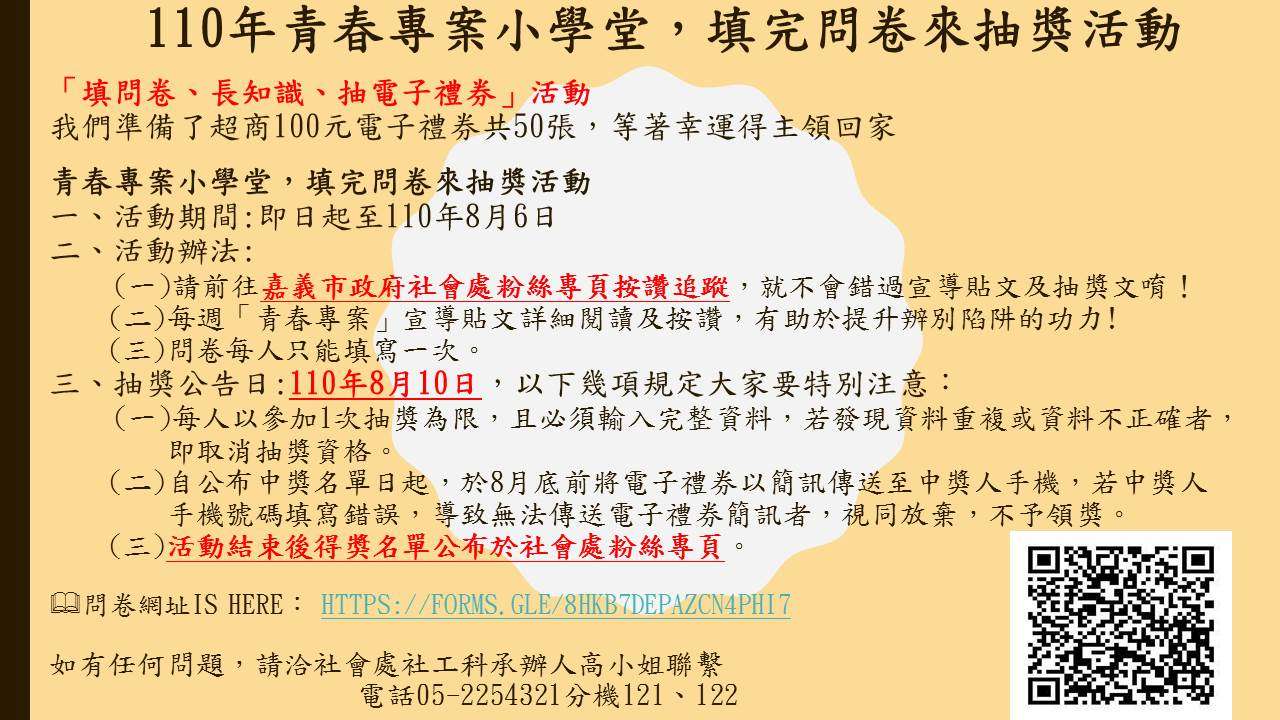 說明: 一、依據兒童及少年性剝削防制條例第3條及衛生福利部110年「暑期保護青少年-青春專案」工作項目基準表辦理。 二、鑒於暑假期間,學生族群較容易接觸不良物質(菸酒、檳榔、毒品),以及近期網路使用安全、兒少性剝削私密照外流等案件日益增加,為強化兒少相關自我保護知能,請利用班級FB、Line等群組傳送問卷連結,鼓勵學生填答。 三、青春專案小學堂,填完問卷來抽獎活動期間自即日起至110年8月6日,欲瞭解更多關於青春專案宣導資源,請追蹤本府社會處粉絲專頁,7-8月每週將有相關貼文宣導。 四、檢附活動辦法DM(電子檔),如有任何問題可電洽本府社會處社會工作科高小姐,05-2254321#121-122。