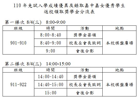 110年免試入學成績優異及錄取嘉中嘉女學生返校領獎分流表異動