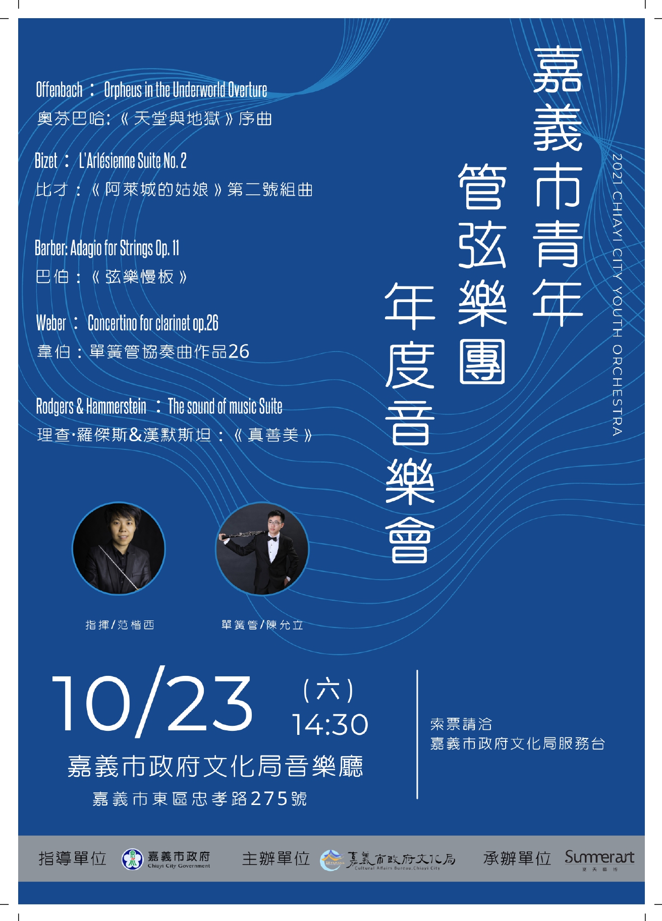 一、本次年度音樂會訂於110年10月23日(六)14:30在本局音樂廳演出。 二、本場音樂會採索票入場,自10月16日上午9時起於本局1樓服務台免費索取,每人限索兩張。